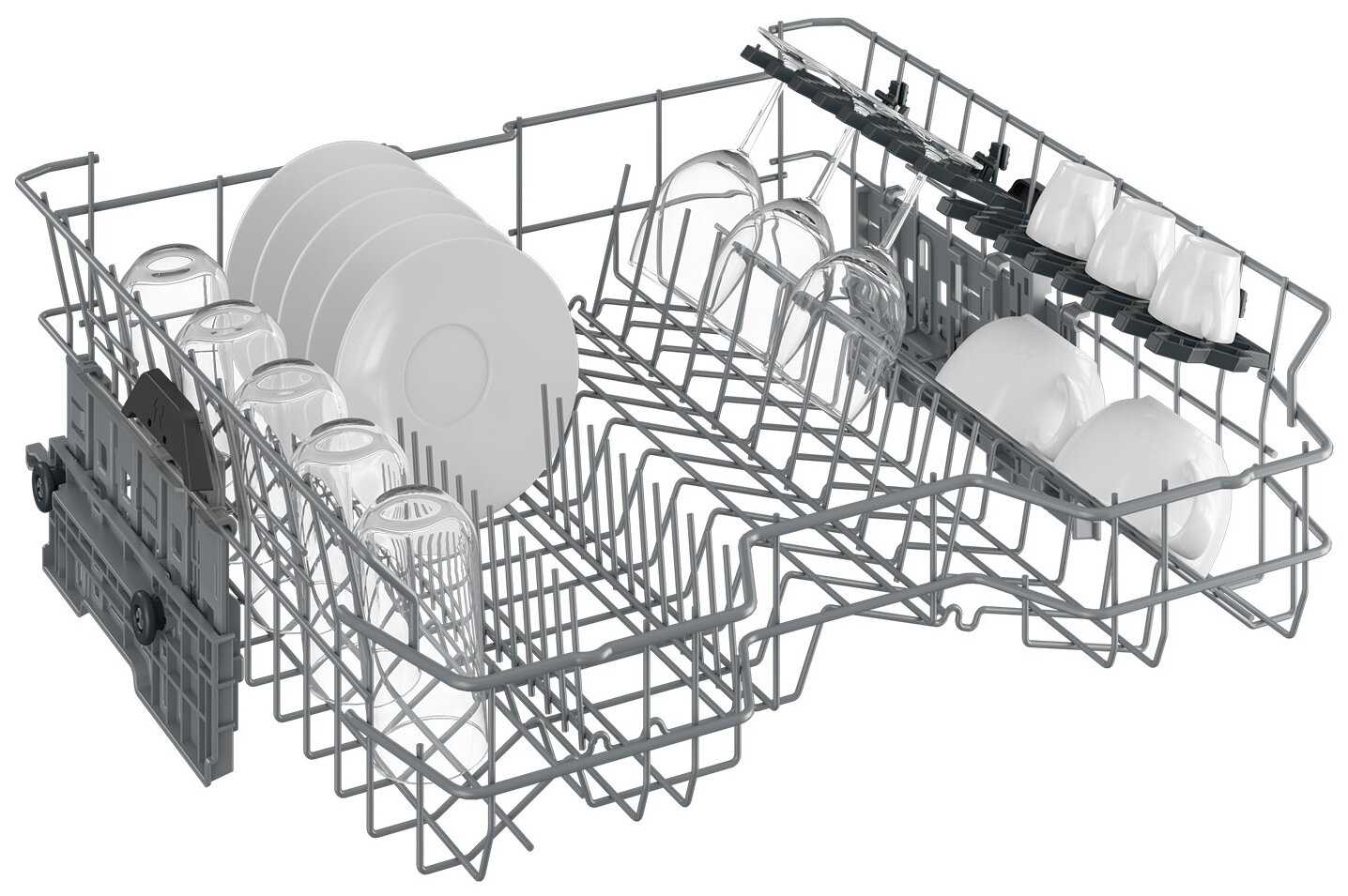 - Верхняя корзина настраивается по высоте (3 уровня), что позволяет размещать высокую посуду, например, кастрюли.