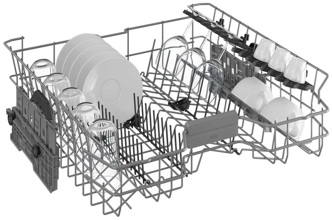 - Верхняя корзина не имеет регулируемых фиксаторов для бокалов на ножке.