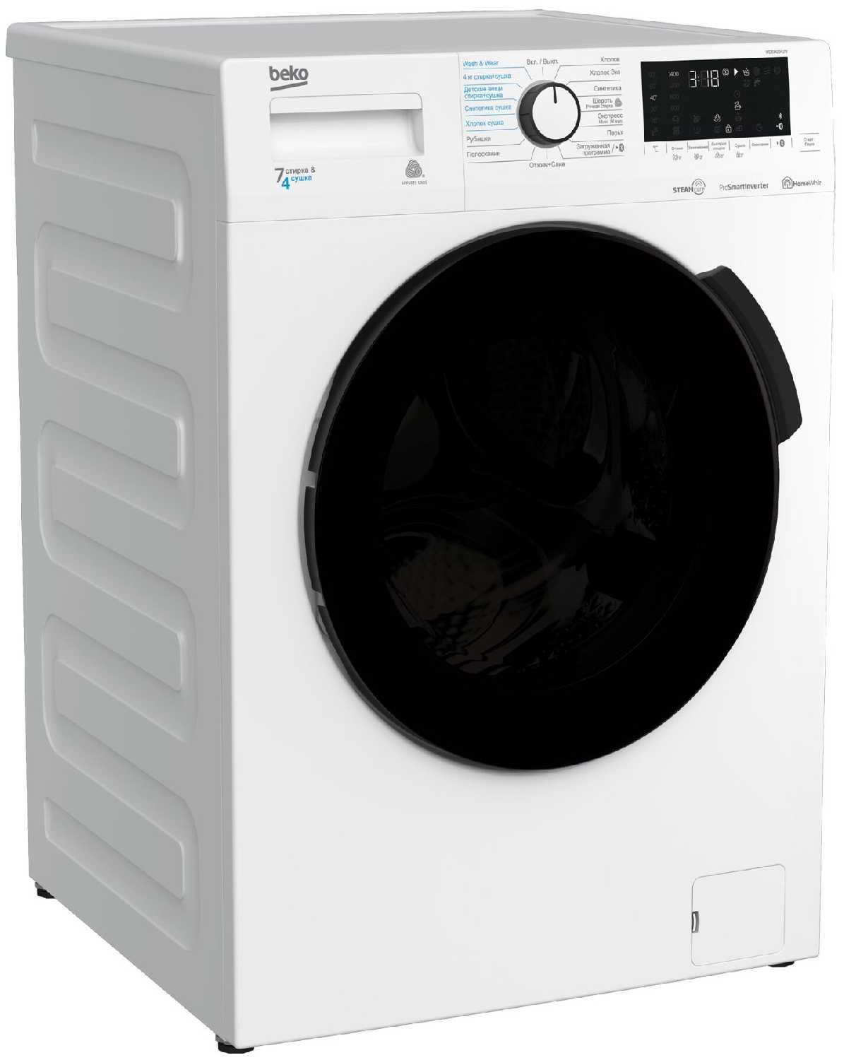 - + На замену старенькой Индезит искал современную машинку с сушкой. Выбрал Beko. Доставили быстро, проверка домашняя 14 дней. Можно было сразу подключить, в комплекте есть шланг 1.2м для воды и держатель для канализационного шланга. Но, так как машинка подключается к трубопроводу через удлинитель, то пришлось соблюдая инструкцию использовать хомуты. Внешний вид - стильный, размер меньше чем у старых машин. Решающим были нужные мне оции: стирка за 14 мин и сушка. Так же есть управление по Bluetooth. Выбор программы осуществляется просто и понятно. Стирает хорошо, резвенько. Не скажу так же что и , тихо в полне себе обычно. Сушит вещи не до конца слегка влажные они что ли, готовые к глажке (Или я включил не все или не те функции). Кроме того машинка не откроет люк пока вещи сильно горячие и не обожжетесь не ими ни паром. Регулировка ножек и сами ножки сделаны удобно и не требуют коврика или подставки. Дисплей видно хорошо.