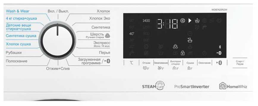 - Возможность корректировки температуры, скорости отжима и уровня влажности после сушки.