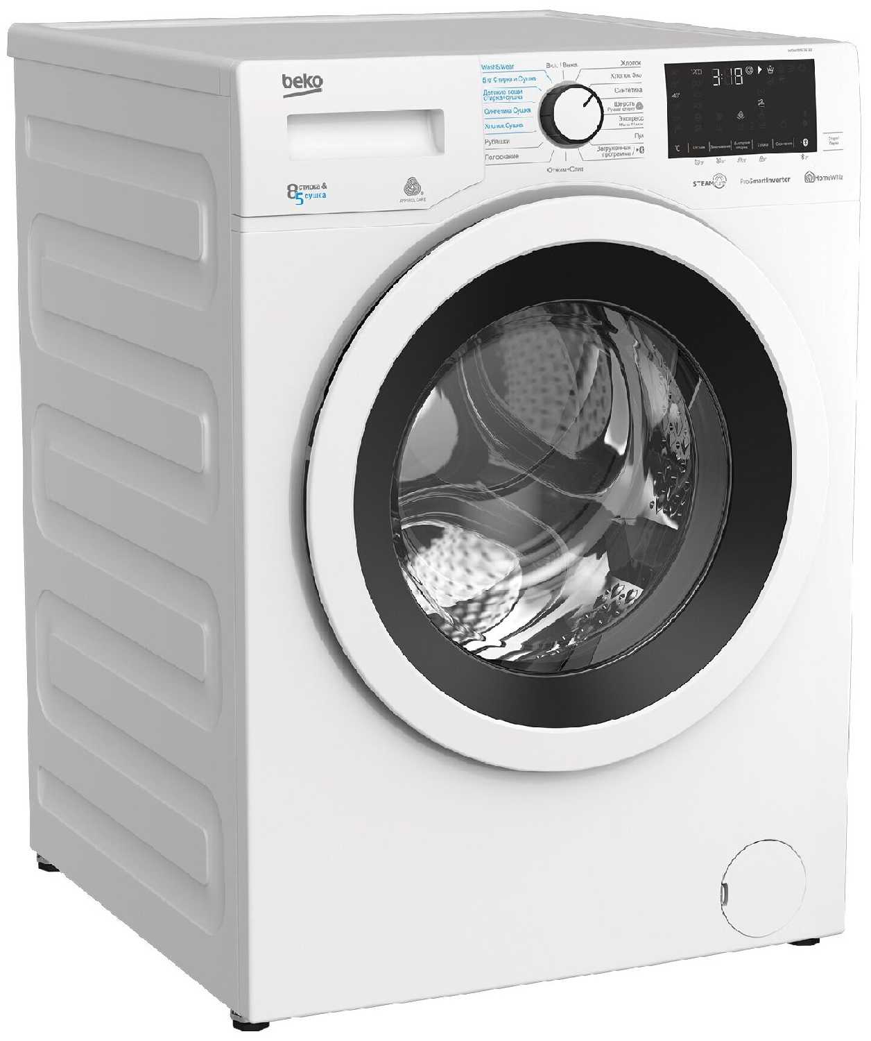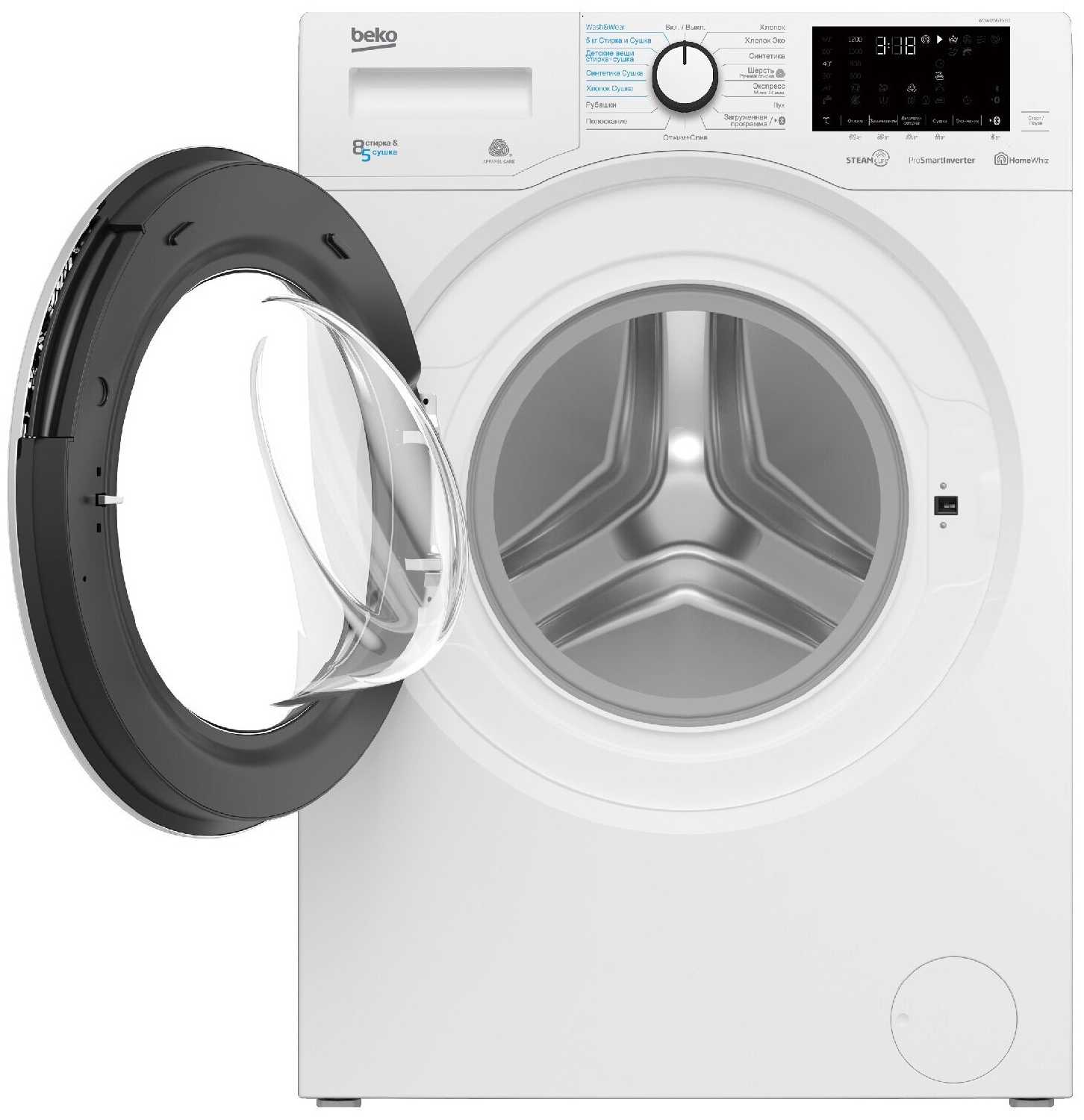 - + большая загрузка: стирка на 8 кг, сушка на 5 кг, 15 программ, удаленное управление, отложенный старт на сутки, обработка белья паром, тихая в работе