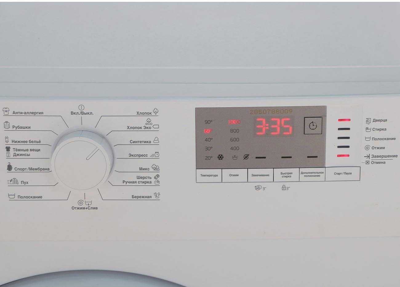 Поворотный селектор и цифровой дисплей обеспечивают интуитивное управление. Ключевое преимущество – гибкая корректировка параметров: в любой программе можно изменить температуру (шаг 10°C в диапазоне 20-90°C), скорость отжима или добавить опции (допполоскание, быстрая стирка). Блокировка кнопок от случайного нажатия предотвращает сброс настроек. -
