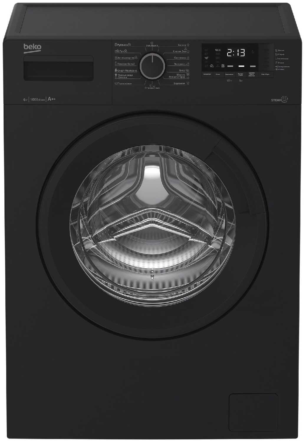 Стирает , вроде есть функция пар, но не понятно. Цвет. Есть дисплей на котором видно сколько осталось времени это большой плюс. Большой барабан 6кг.