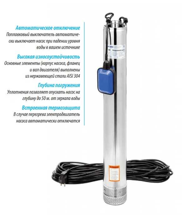 Функции : | встроенный обратный клапан, защита от перегрева, защита от сухого хода, поплавковый выключатель |