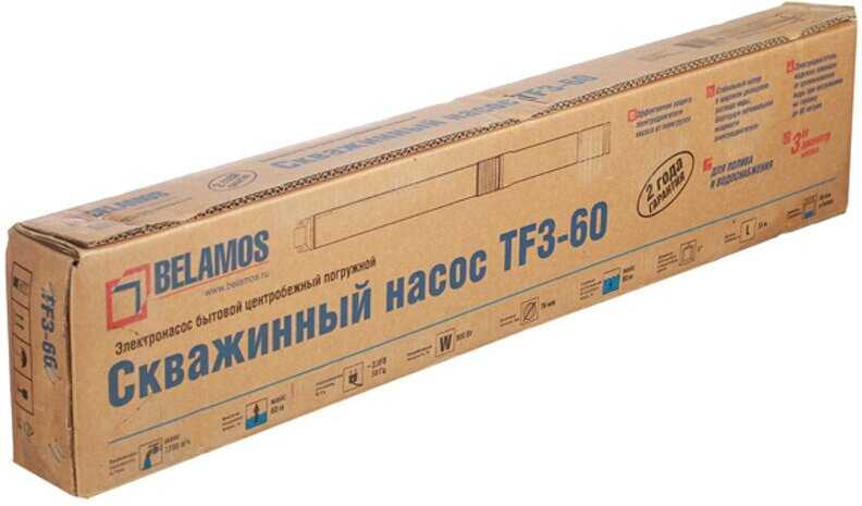 Подробная комплектация : | 1. Заводская упаковка - 1 шт 2. Скважинный насос Belamos TF3-60 с кабелем 35 м - 1 шт 3. Инструкция - 1 шт |