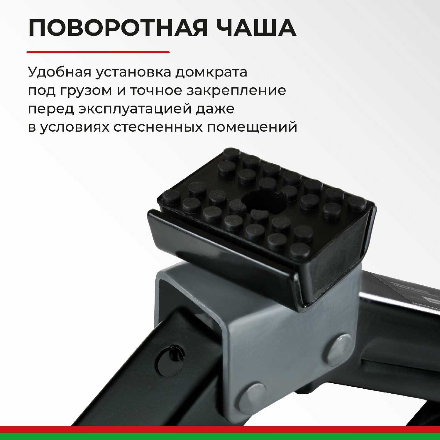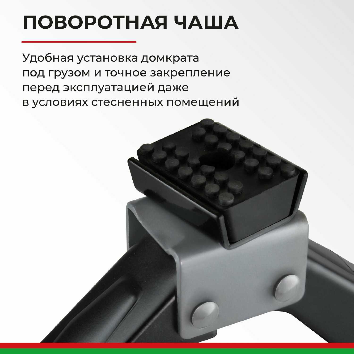 - Ромбическая конструкция обеспечивает равномерный подъем без перекоса на ровной поверхности, что повышает стабильность при замене колес.