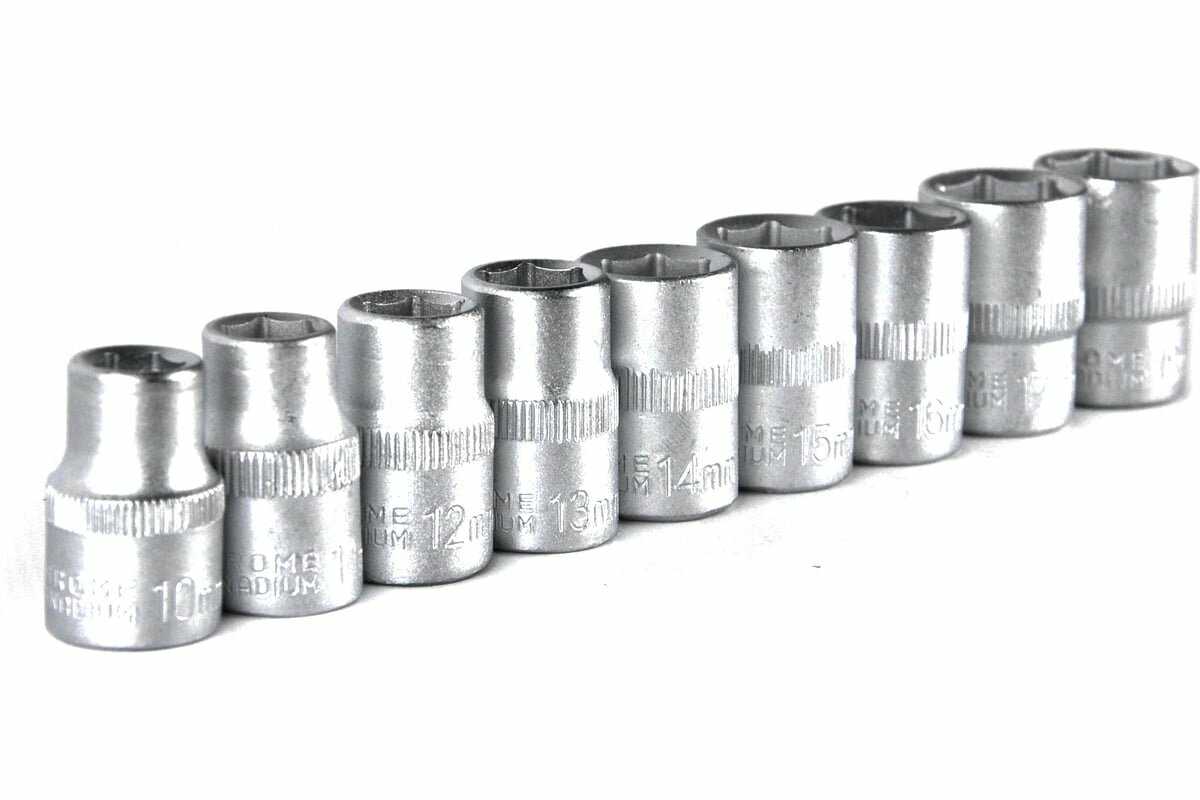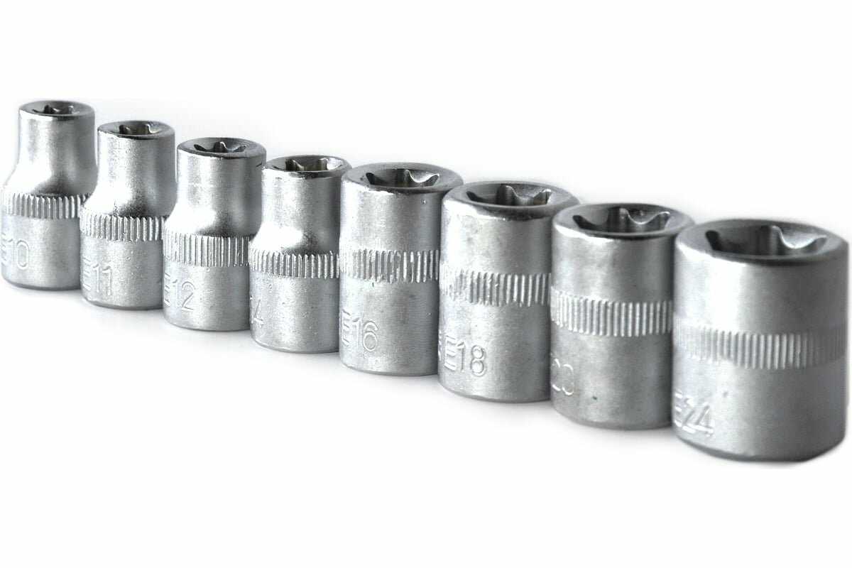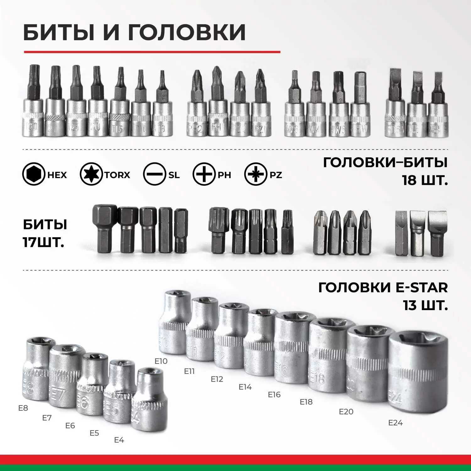 | Головки торцевые подробно : | головки торцевые 12-ти гранные 1/4" длиной 25 мм: 4 4.5 5 5.5 6 7 8 9 10 11 12 13 14 мм, -головки торцевые 12-ти гранные 1/4" длиной 50 мм: 6 7 8 9 10 11 12 13 мм, -головки торцевые Е-профиль 1/4" длиной 25 мм: Е4 Е5 Е6 Е7 Е8 |