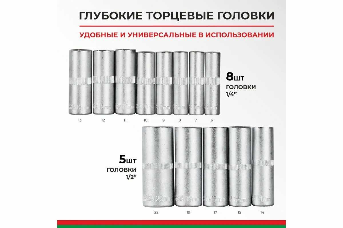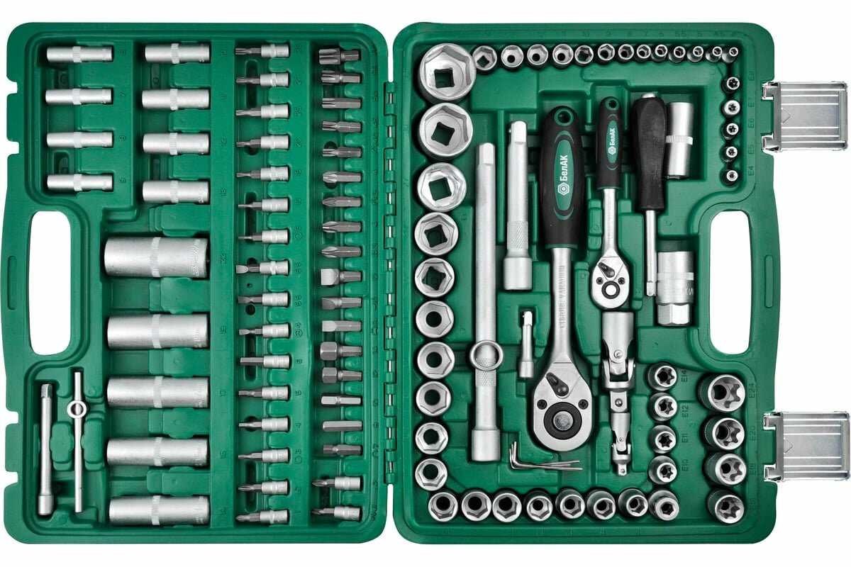 В наборе присутствуют все основные размеры головок и ключей, необходимые для ремонта авто и дома, включая нужные для мопеда или Жигулей. Пользователи подтверждают, что есть разнообразные головки, ключи и удлинители для базовых работ, и ничего не замяли при использовании. Однако иногда встречаются несоответствия, как отсутствие головки на 32 мм вместо которой лежит на 30 мм, или криво сделанная просечка на одной головке. Для оказания первой помощи или легкого ремонта все нужное на месте. В целом, комплектность хвалят за полноту, но рекомендуют проверять при распаковке. -