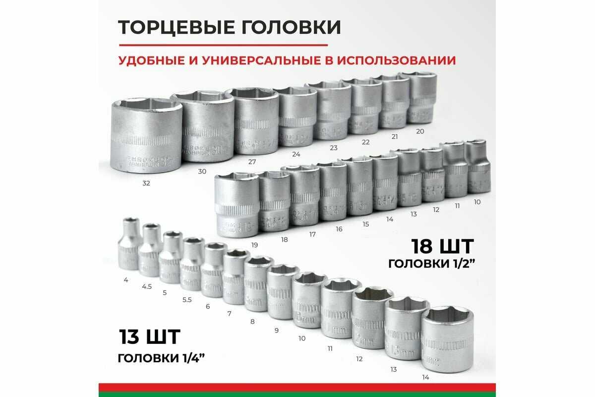 Классный набор. И метал тоже достойный в этом наборе. Качественная сборка. Трещотки все так же хорошие и качественные. В принципе инструмент очень хороший и качественный. Основные размеры головок присутствуют все. ( для бытового использования или мелкого ремонта )