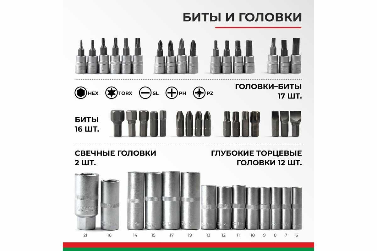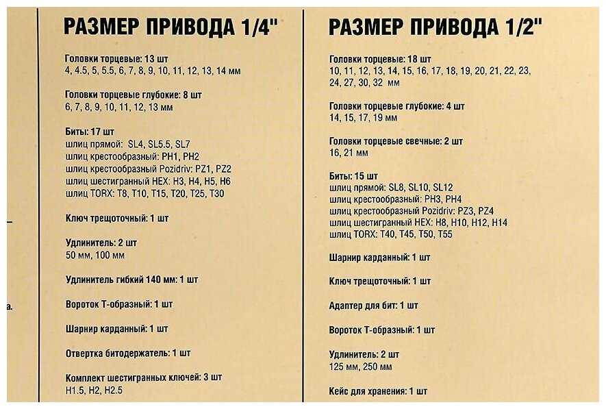Инструменты в комплекте : | вороток для головок, ключи имбусовые (шестигранные), отвёртки, трещотка |