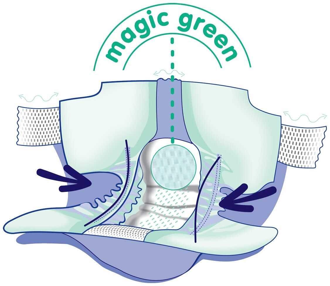 | Особенности : | антисептические добавки, боковые внутренние бортики, большая упаковка, многоразовые застежки-липучки, эластичные резинки вокруг ножек, эластичный пояс |