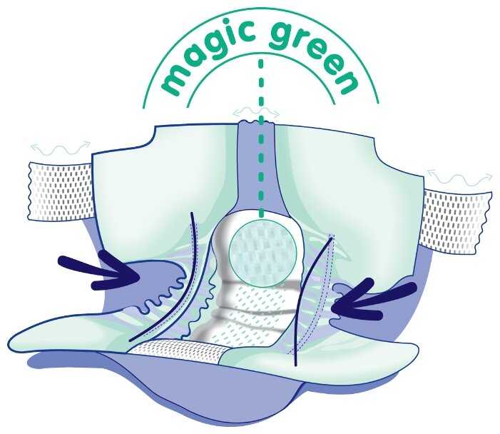 | Особенности : | антисептические добавки, боковые внутренние бортики, большая упаковка, эластичные резинки вокруг ножек, эластичный пояс |