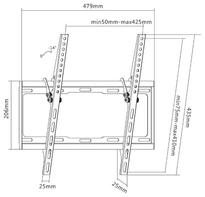 | Дополнительная информация : | расстояние от стены 25 мм, угол наклона -14°, совместимость кронштейна для крепления телевизора 50-425 мм по ширине 75-410 мм по высоте, встроенный уровень |