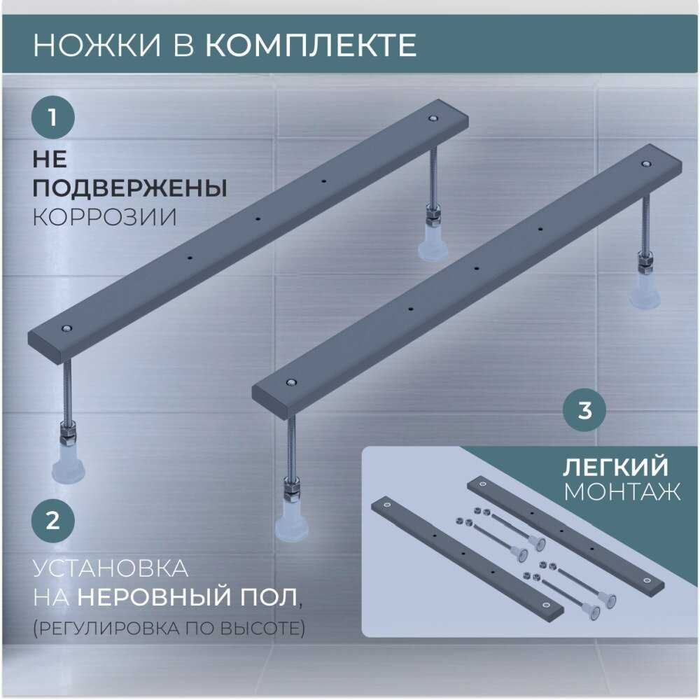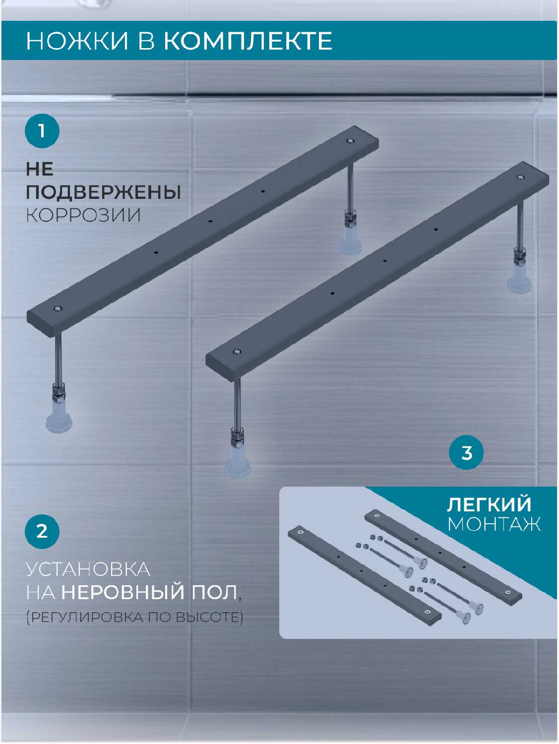 Особенности : | противоскользящее покрытие дна, регулируемая высота ножек, съемная фронтальная панель, установка на каркас |