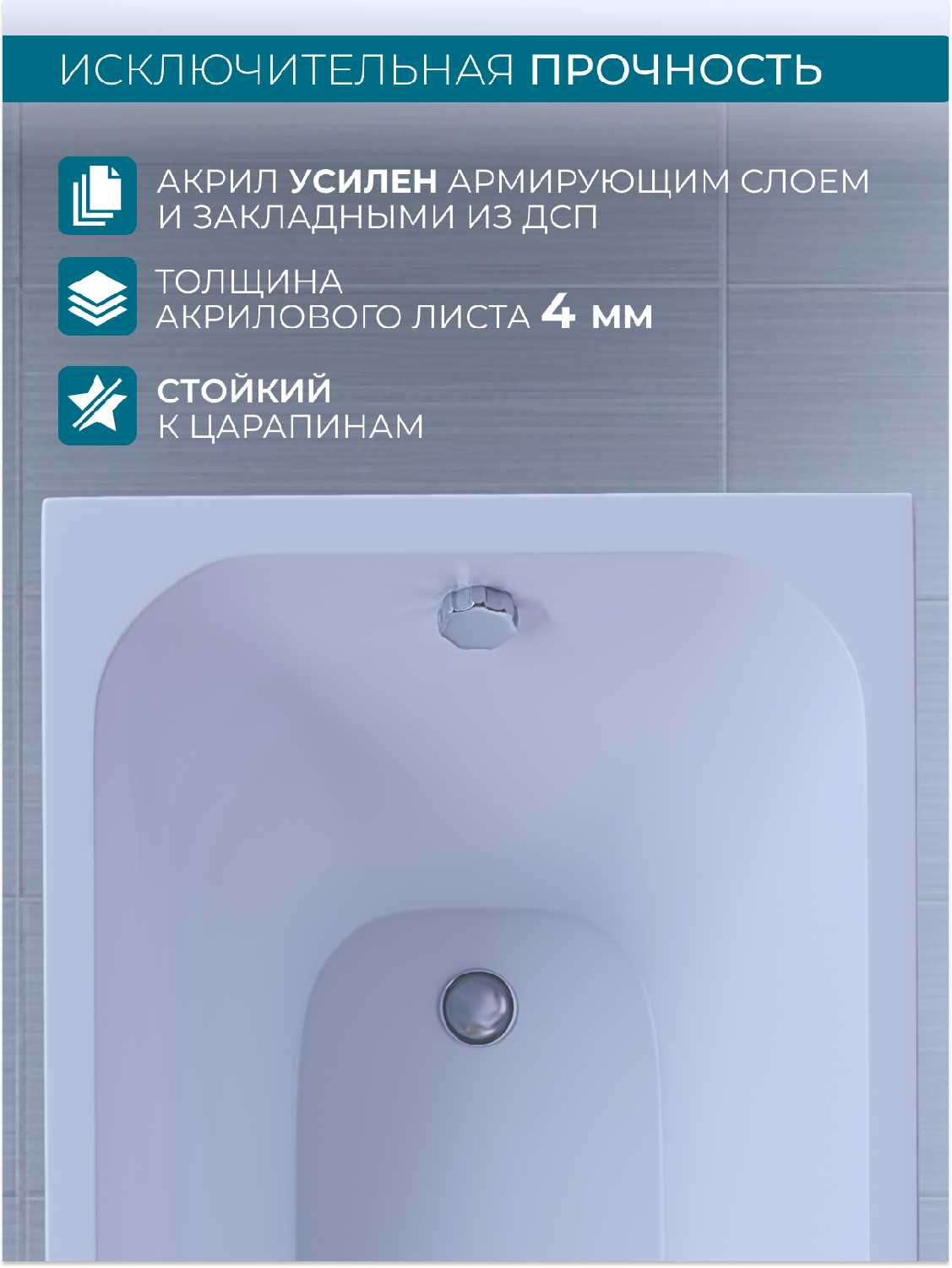| Дополнительная информация : | Простая установка: ванна имеет не большой вес, обеспечивая легкий монтаж. |