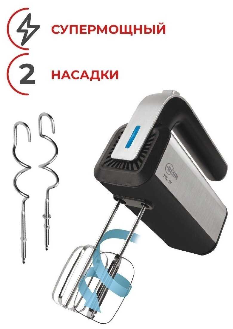 - Мощный двигатель позволяет взбивать белки, сливки и тесто до пиков за 1-2 минуты.