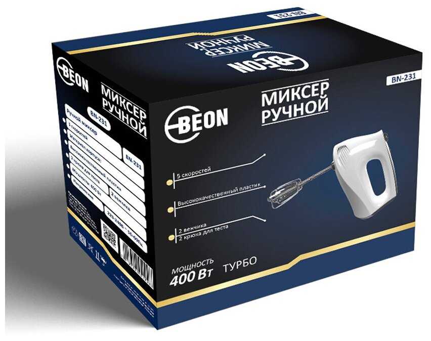 Комплектация прибора состоит из венчиков и спиралевидных крюков для замешивания теста, которые изготовлены из качественного нержавеющего сплава. Металл не подвергается деформации и не покрывается коррозией из-за частого взаимодействия с жидкостью. Для надежной фиксации насадки оснащены специальными выпуклыми ограничителями. Миксер имеет эргономичную ручку. Корпус из пластика не подвержен механическим повреждениям.