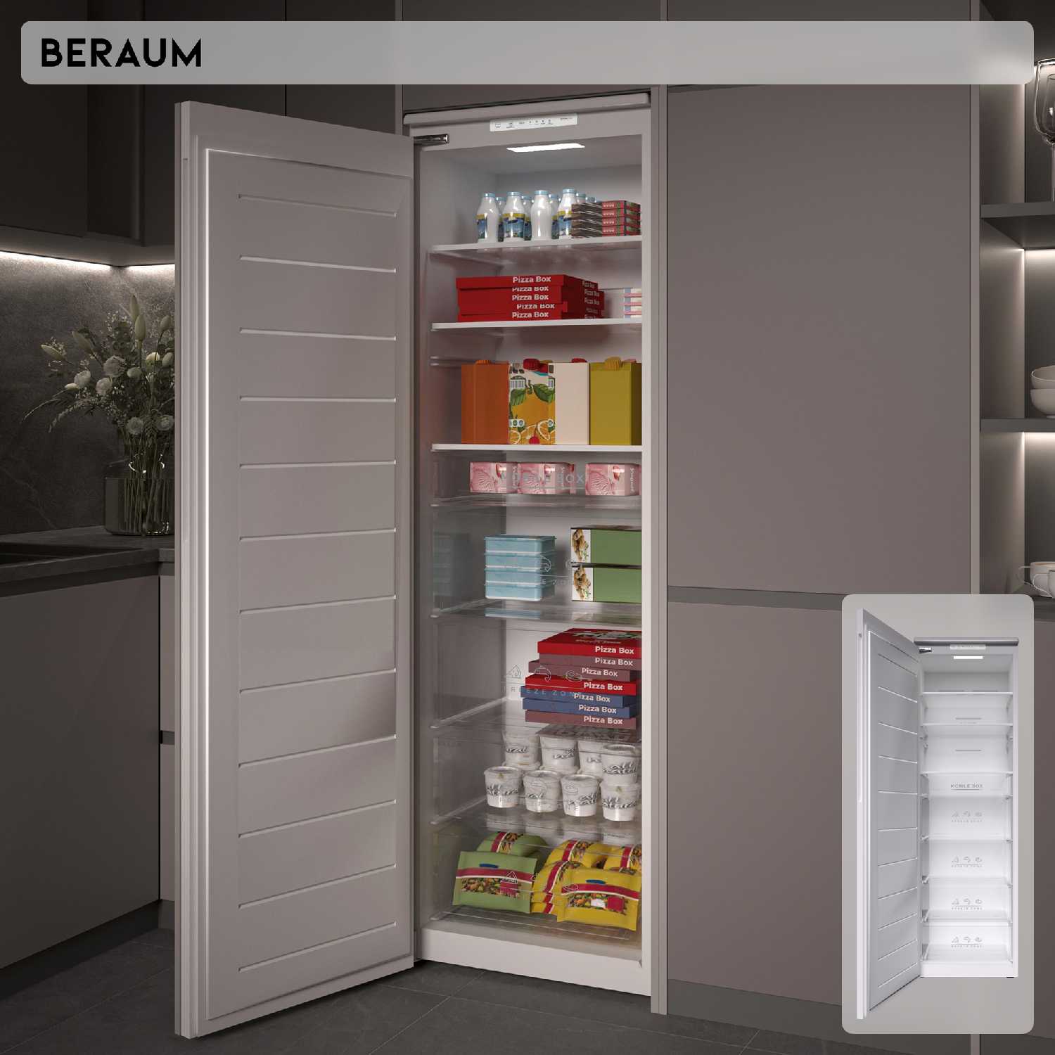 Еще не встроили, но используем уже несколько недель. Отличная машина, судя по инструкции умеет в режиме холодильника (не пробовали). Было отключение света на 10 часов, пережил, ничего сильно не успело разморозиться и наледи после включения не образовалось. Можно переставлять полки и увеличивать пространство, например для высоких тортов. Довольно тихий, пока что стоит около спальни и его не замечаешь абсолютно, особенно в сравнении с давно стоящим на кухне холодильником.