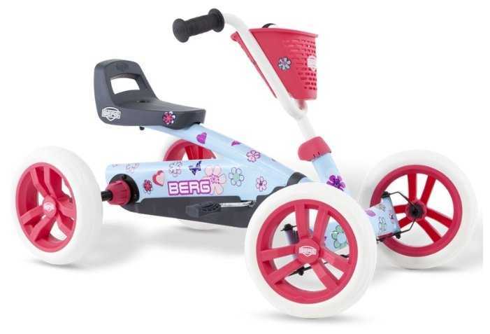 - + Баззи блум – веломобиль для ленивых детей)) Ну или для совсем маленьких. Сзади у него есть ручка, благодаря которой, если ребёнок устал, можно помочь ему «доехать». Цвет очень девочковый – белый с розовым. Педальки удобные. Наклейки уникальные – сам ребенок решает...