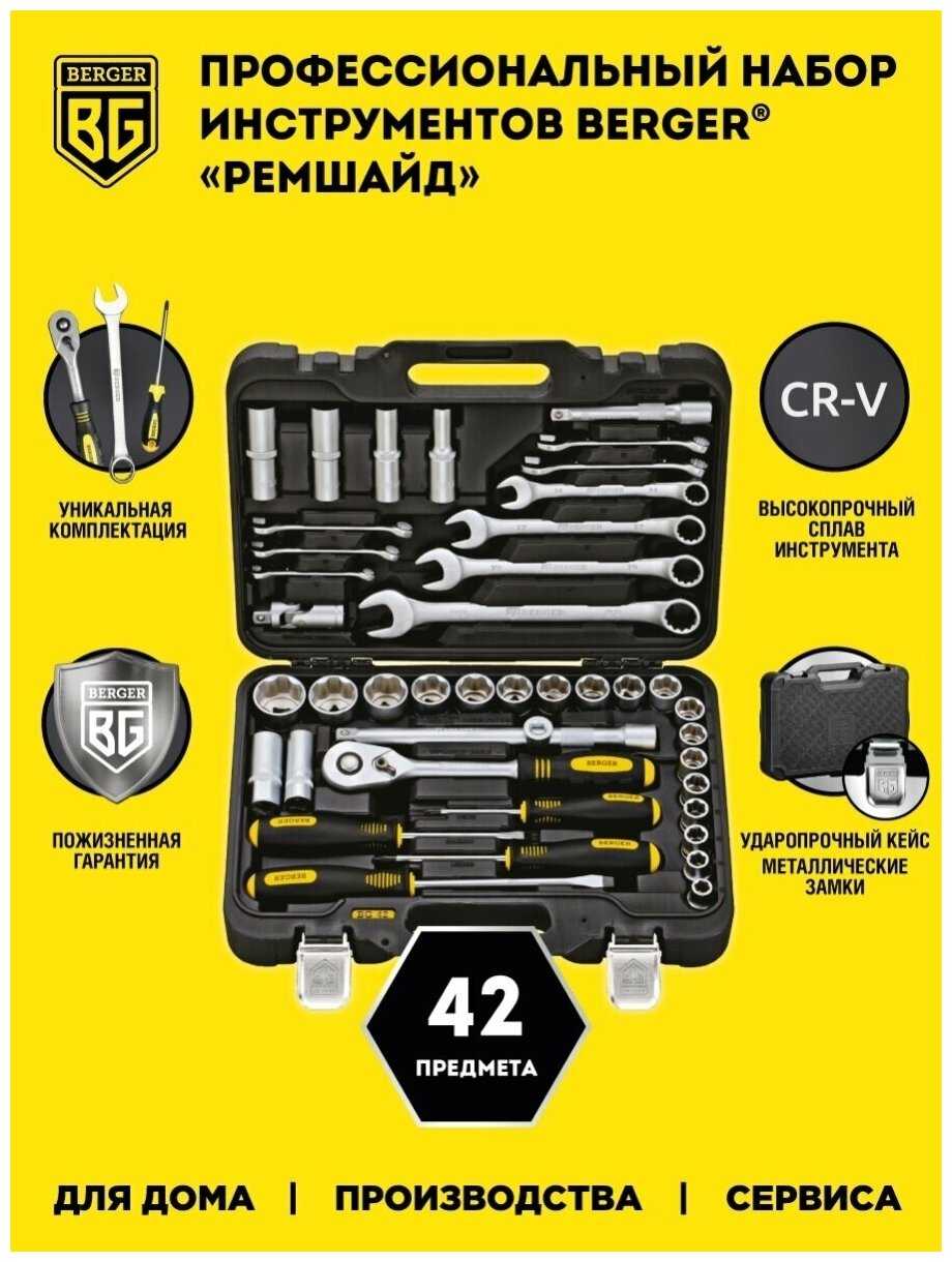 Инструменты в комплекте : | вороток для головок, зубила, ключ разводной, ключи гаечные, ключи имбусовые (шестигранные), молоток, отвёртки, трещотка |
