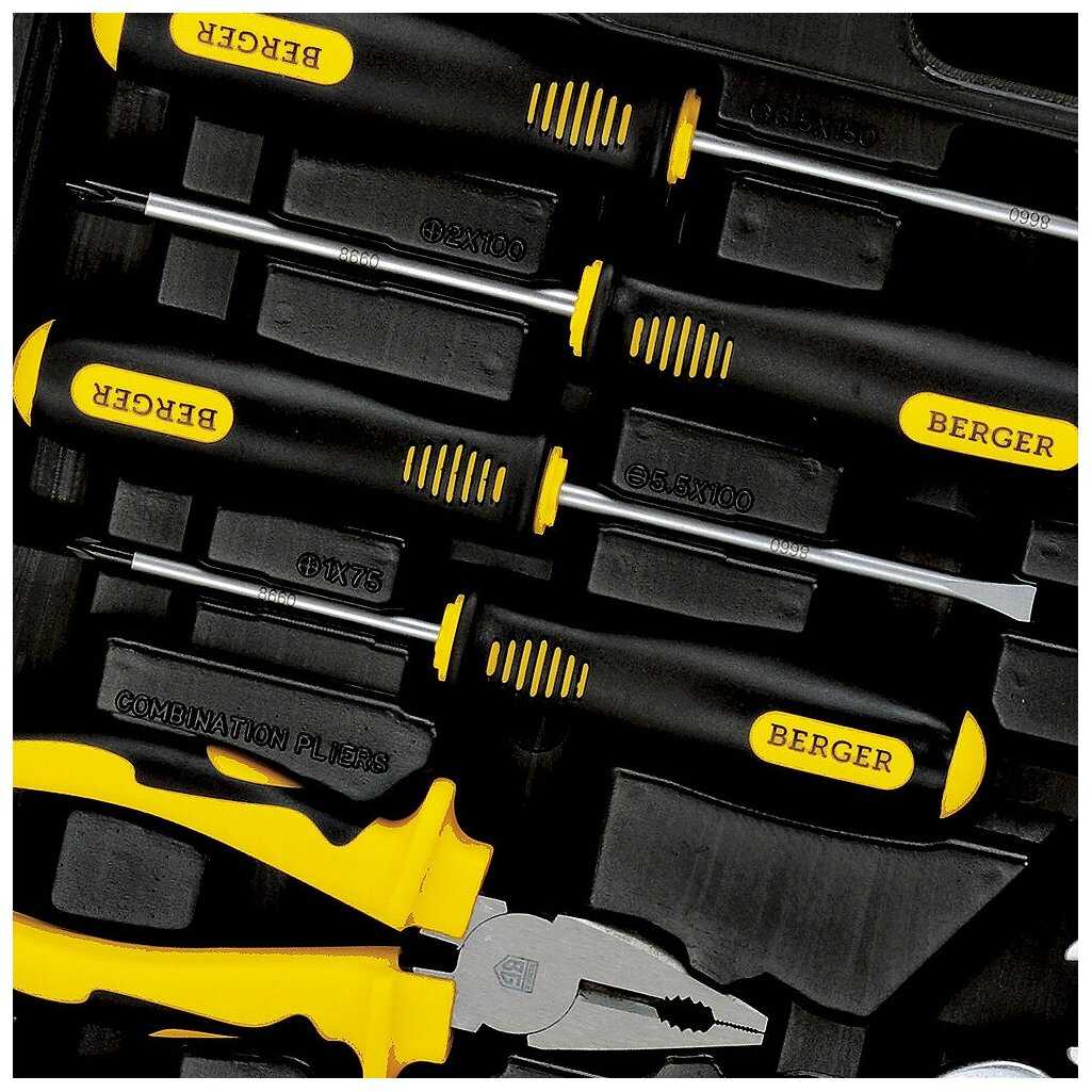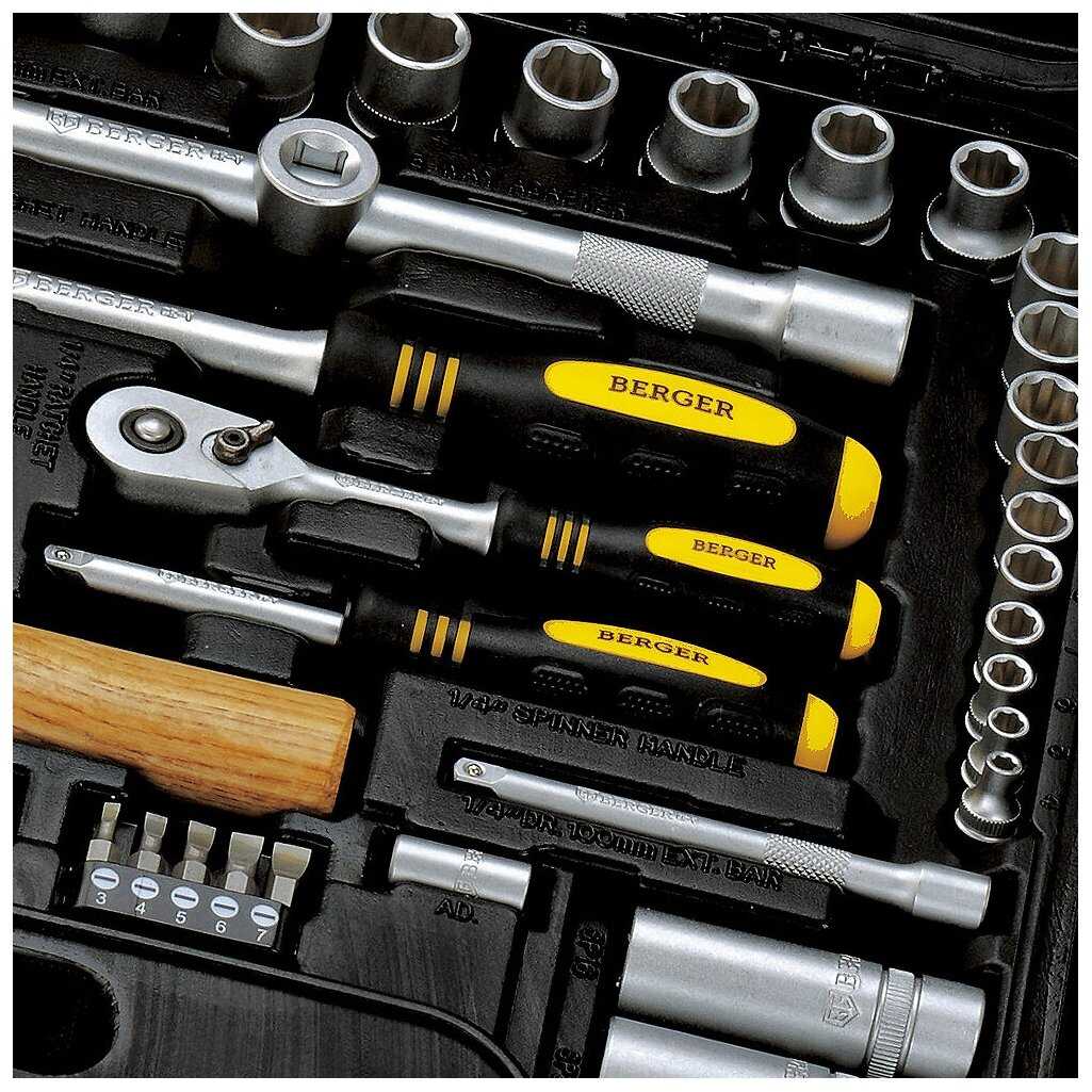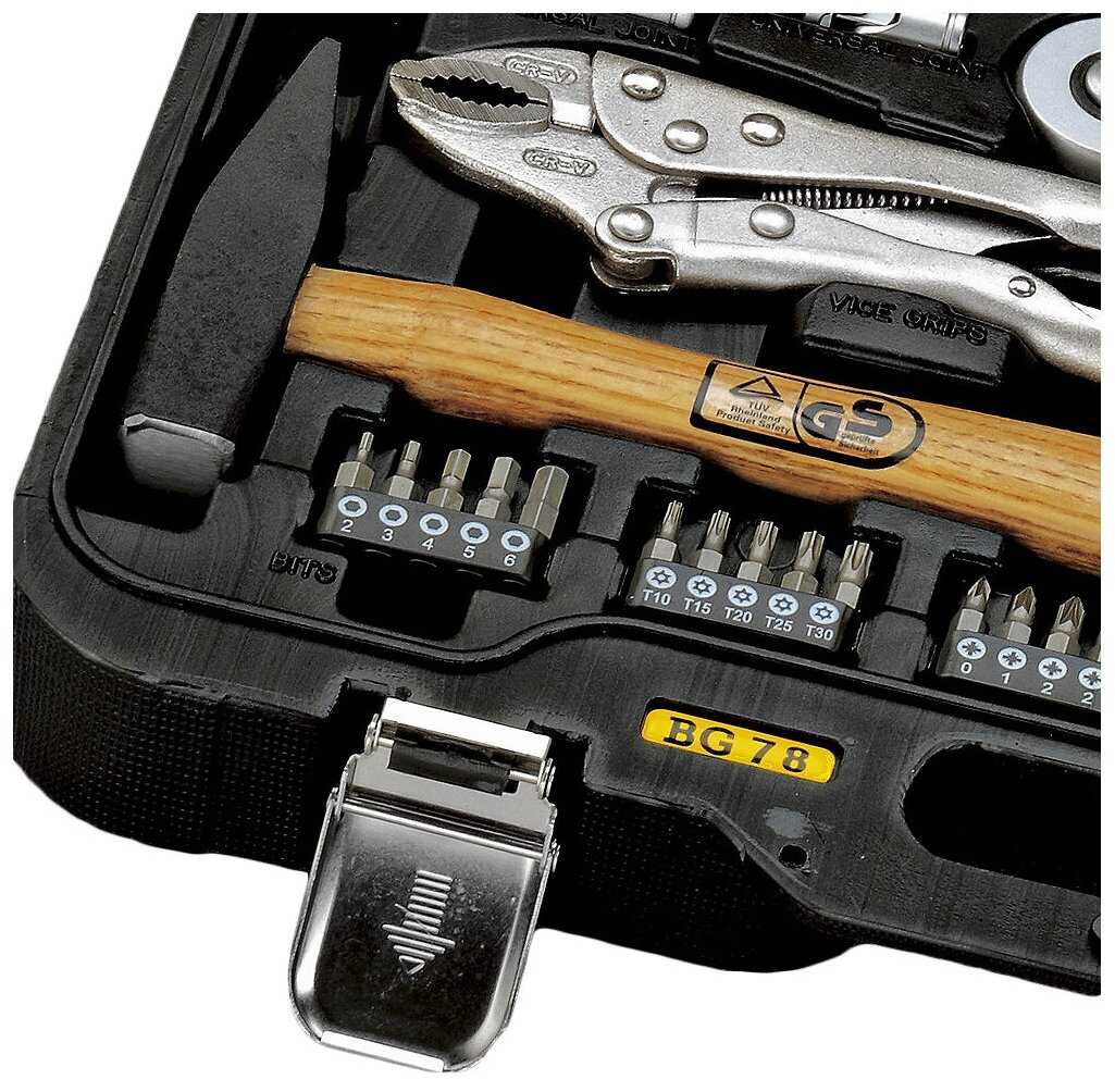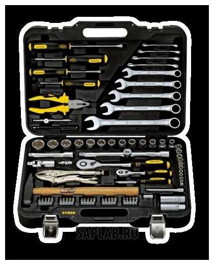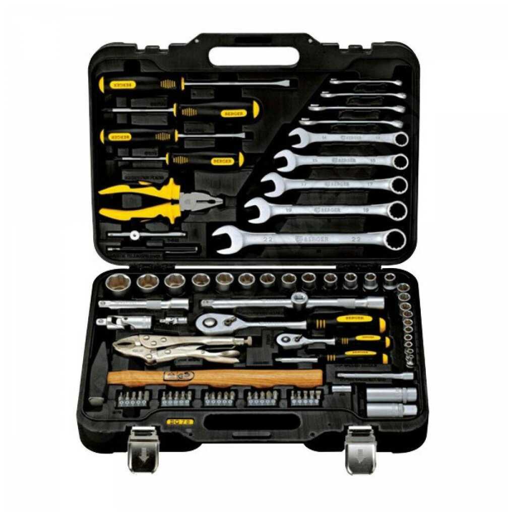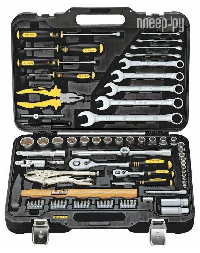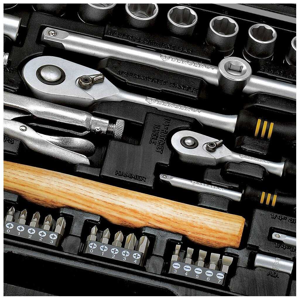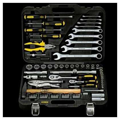 Инструменты в комплекте : | вороток для головок, ключ разводной, ключи гаечные, ключи имбусовые (шестигранные), молоток, отвёртки, пассатижи, рукоять для бит, рукоять для головок, тонкогубцы, трещотка |