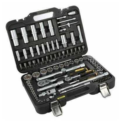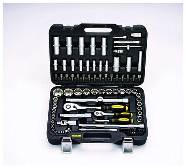 Инструменты в комплекте : | вороток для головок, ключи гаечные, ключи имбусовые (шестигранные), отвёртки, рукоять для бит, трещотка |