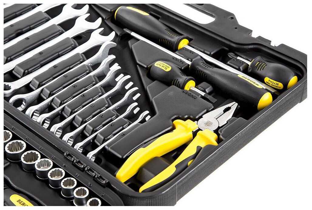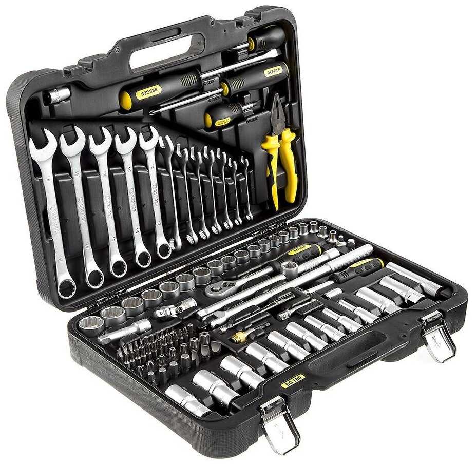 | Инструменты в комплекте : | бокорезы, вороток для головок, ключ разводной, ключи гаечные, ключи имбусовые (шестигранные), ключи торцевые, молоток, отвёртки, пассатижи, плоскогубцы, рукоять для бит, трещотка |