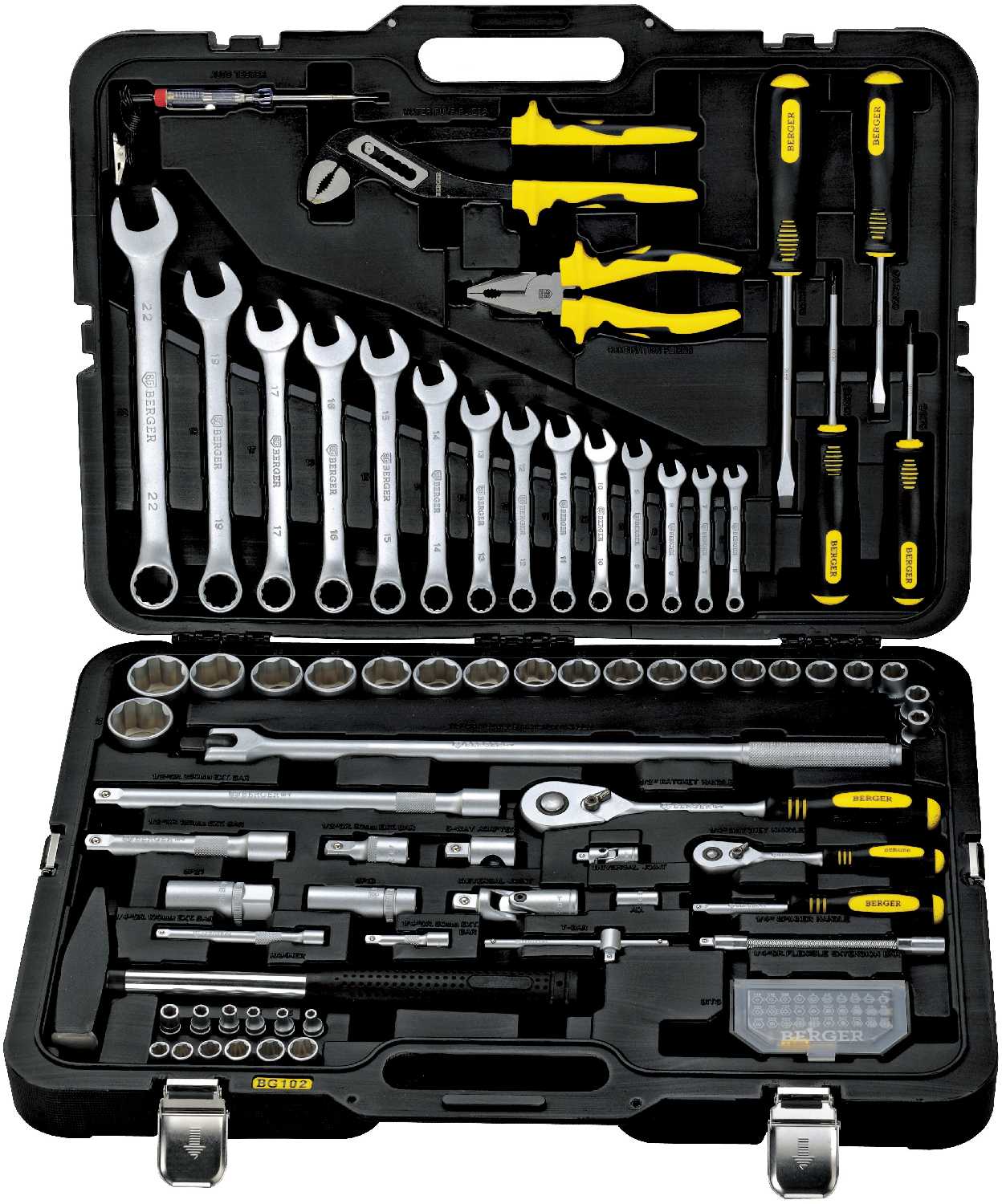 | Инструменты в комплекте : | вороток для головок, длинногубцы, клещи, клещи переставные, ключ переставной гаечный, ключ разводной, ключи гаечные, ключи имбусовые (шестигранные), ключи торцевые, круглогубцы, молоток, отвёртки, отвёртки для точных работ, пассатижи, плоскогубцы, рукоять для бит, тонкогубцы, трещотка |
