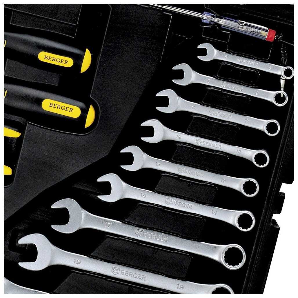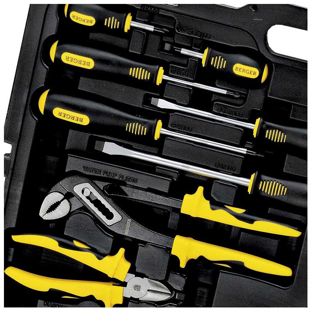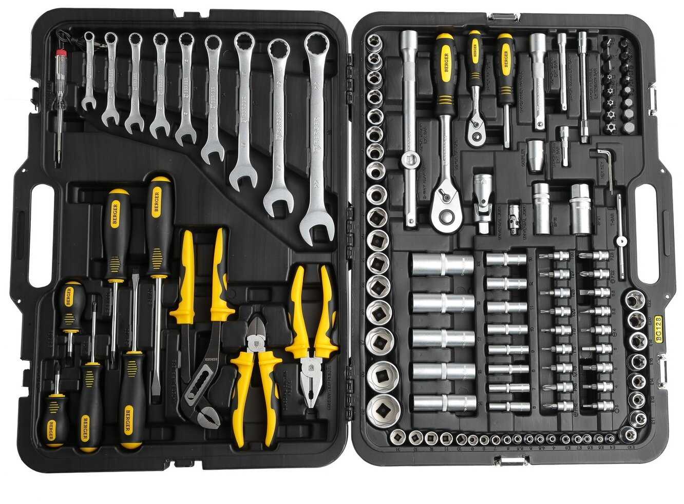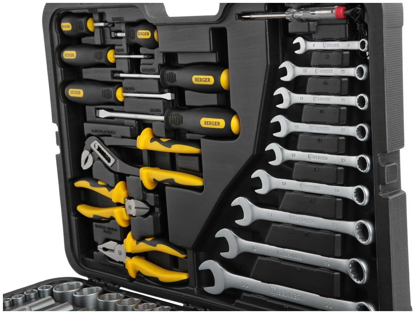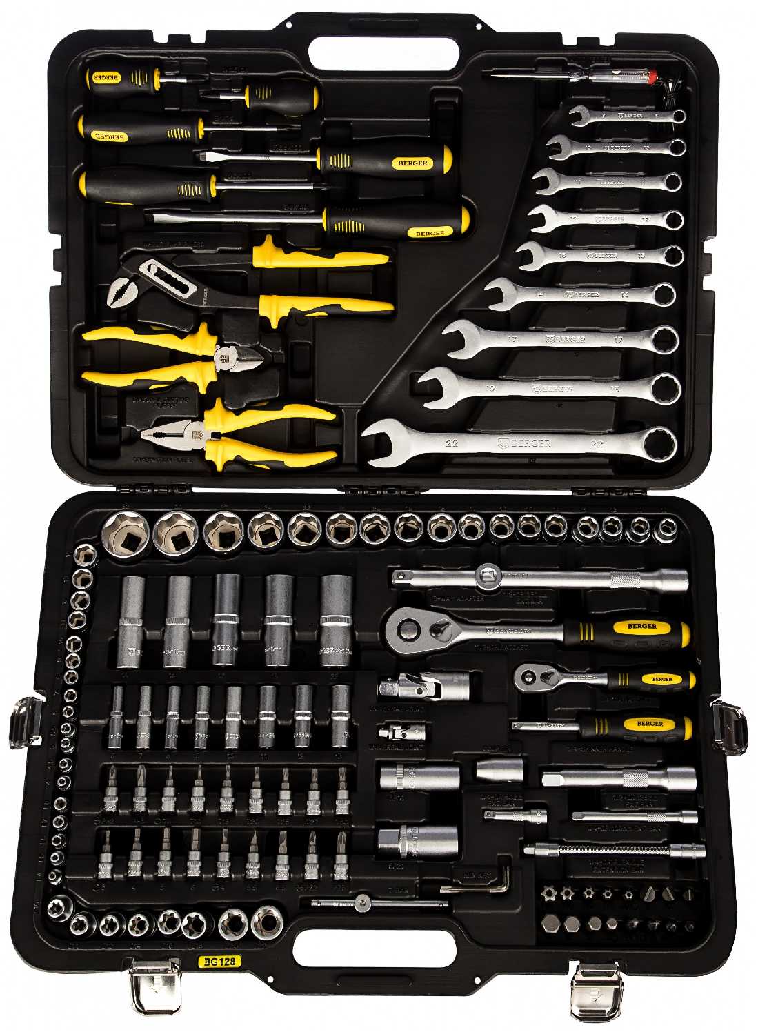 Инструменты в комплекте : | бокорезы, вороток для головок, клещи, клещи переставные, ключ переставной гаечный, ключ разводной, ключи гаечные, ключи имбусовые (шестигранные), ключи торцевые, круглогубцы, кусачки, молоток, отвёртки, отвёртки для точных работ, пассатижи, плоскогубцы, рукоять для бит, рукоять для головок, трещотка |