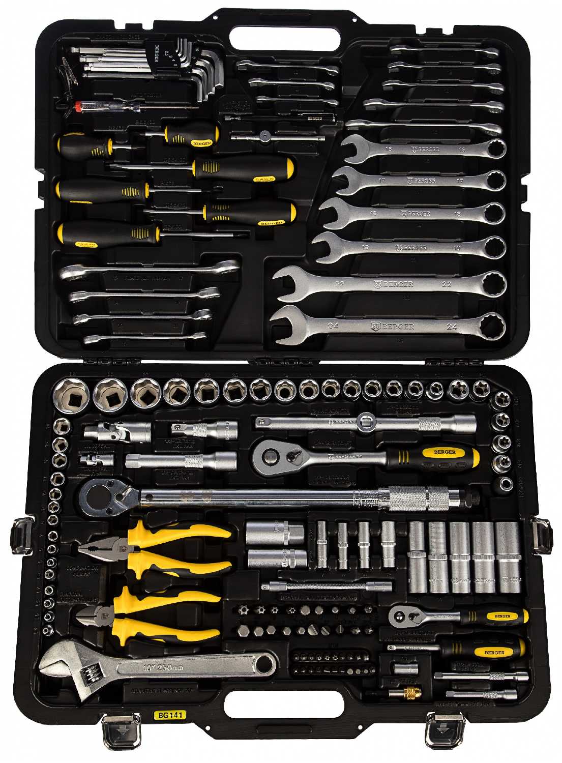 Отличное качество всех комплектующих, включая чемодана. Качественные механизмы трещоток, хороший материал прорезиненных ручек (не скользят в руке при попадании масла или других жидкостей и не разлазятся как на многих полупрофессиональных наборах ) Лезвия на пассатижах и бокорезах очень точно подогнаны, даже волосы на руке состригают как ножницы.