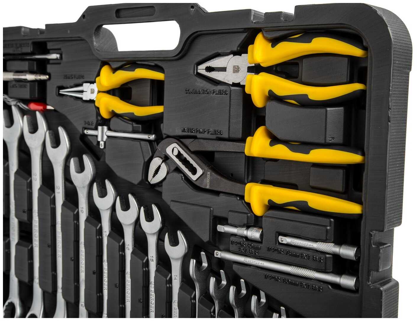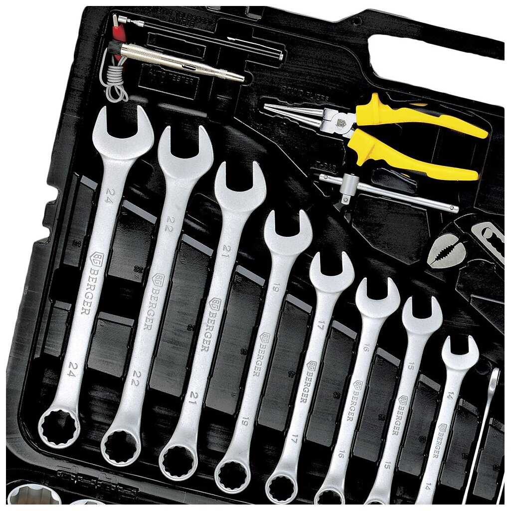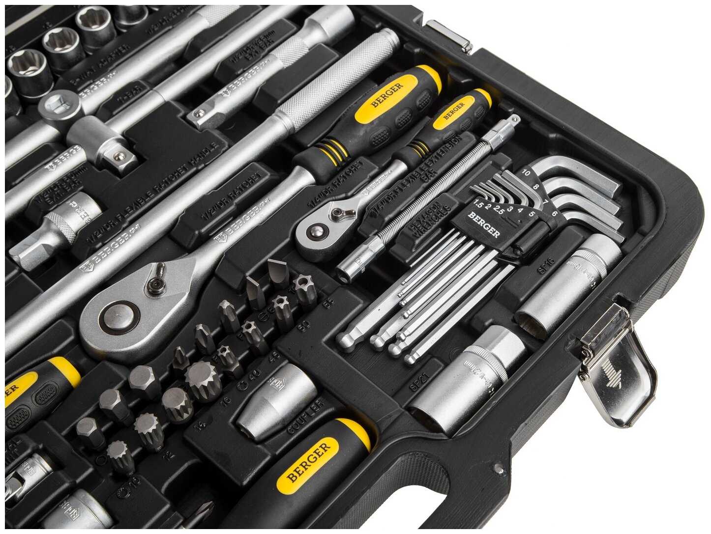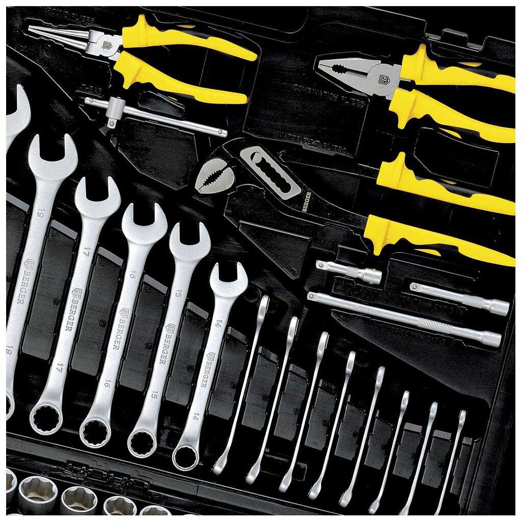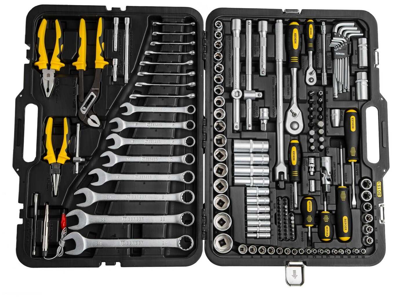 Инструменты в комплекте : | бокорезы, бородок, вороток для головок, длинногубцы, клещи, клещи переставные, ключ переставной гаечный, ключ разводной, ключи гаечные, ключи имбусовые (шестигранные), ключи торцевые, круглогубцы, молоток, отвёртки, пассатижи, плоскогубцы, рукоять для бит, рукоять для головок, тонкогубцы, трещотка |