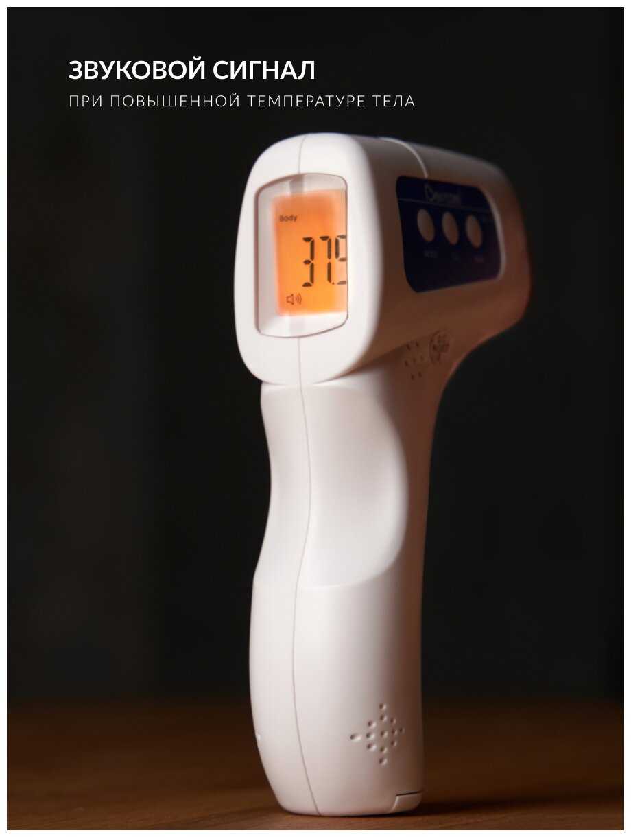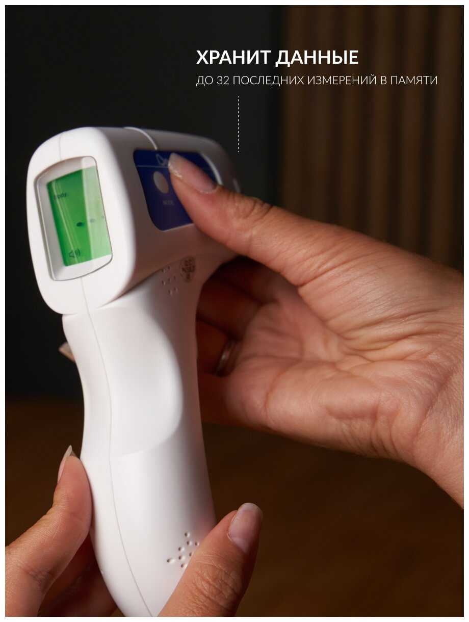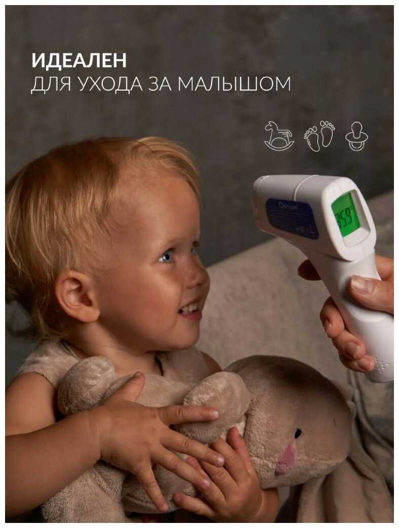 - Дистанционный замер (3-5 см от лба) исключает контакт с кожей, что гигиенично и удобно для спящего ребёнка.