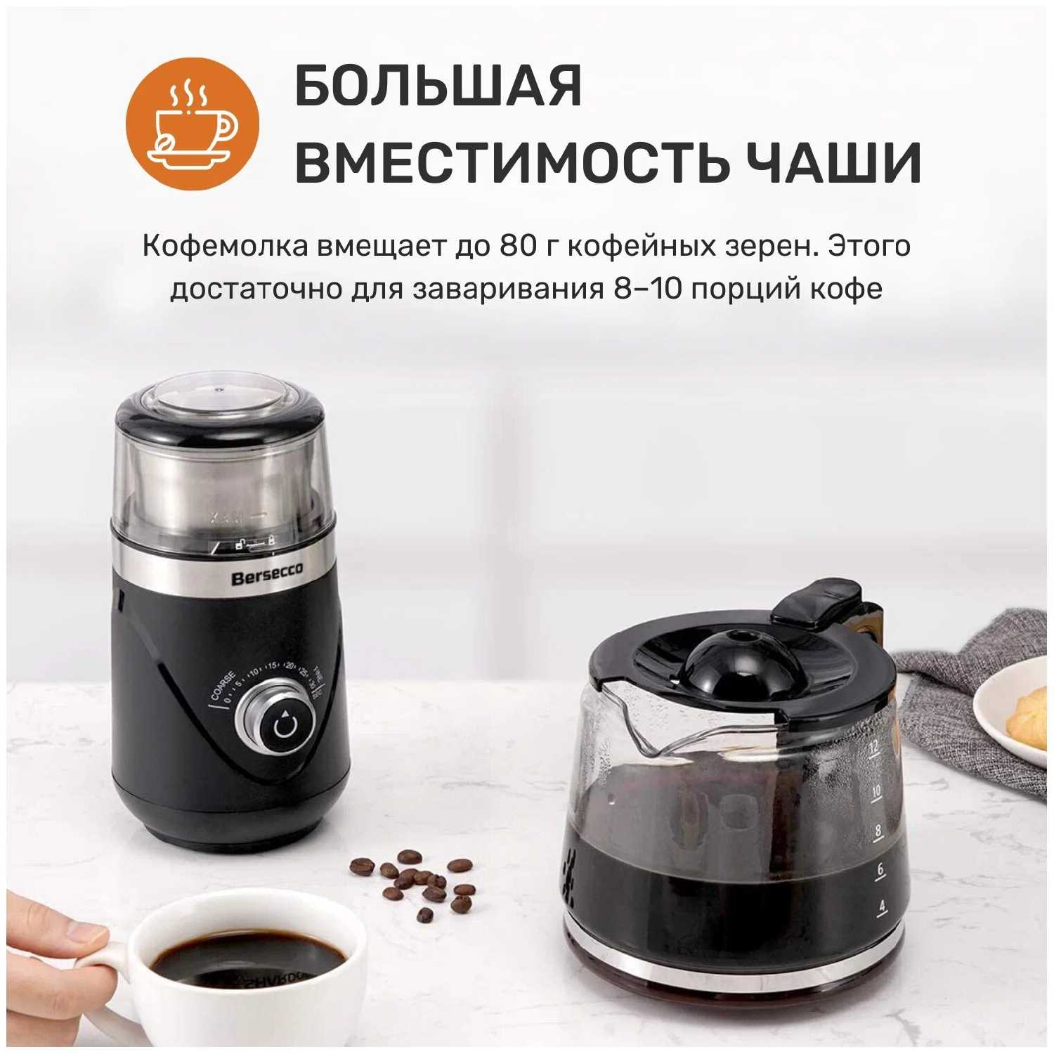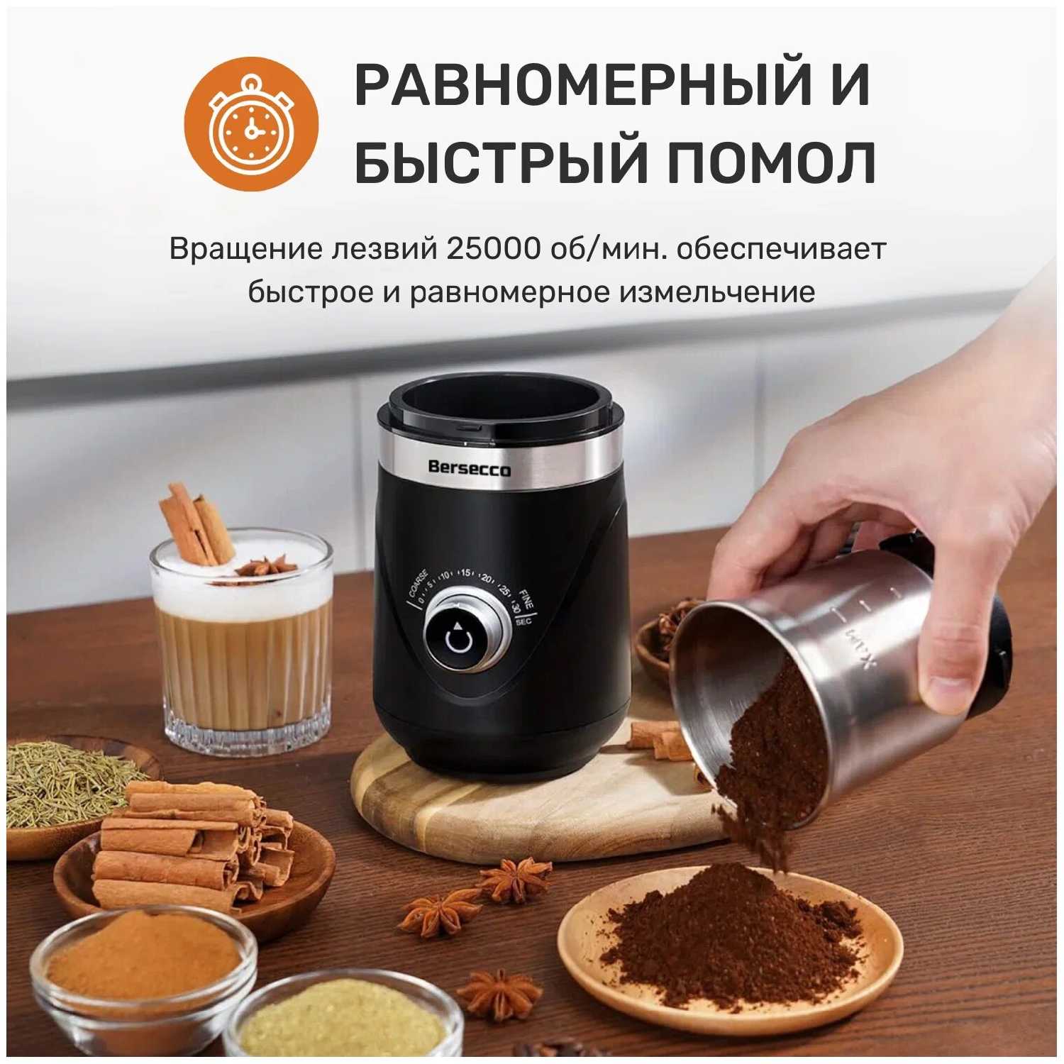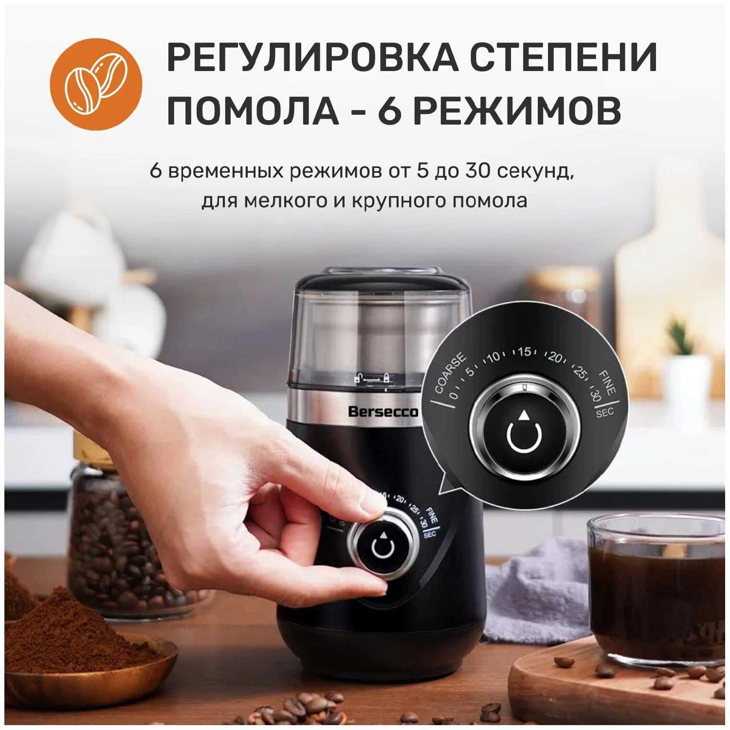 - + Есть регулировка степени помола от 0 до 30 секунд: 5- крупный помол, 10-15- средний помол и 20-30 мелкий помол. Съёмную чашу удобно чистить и мыть. Комфортная длина провода. Автоматический таймер