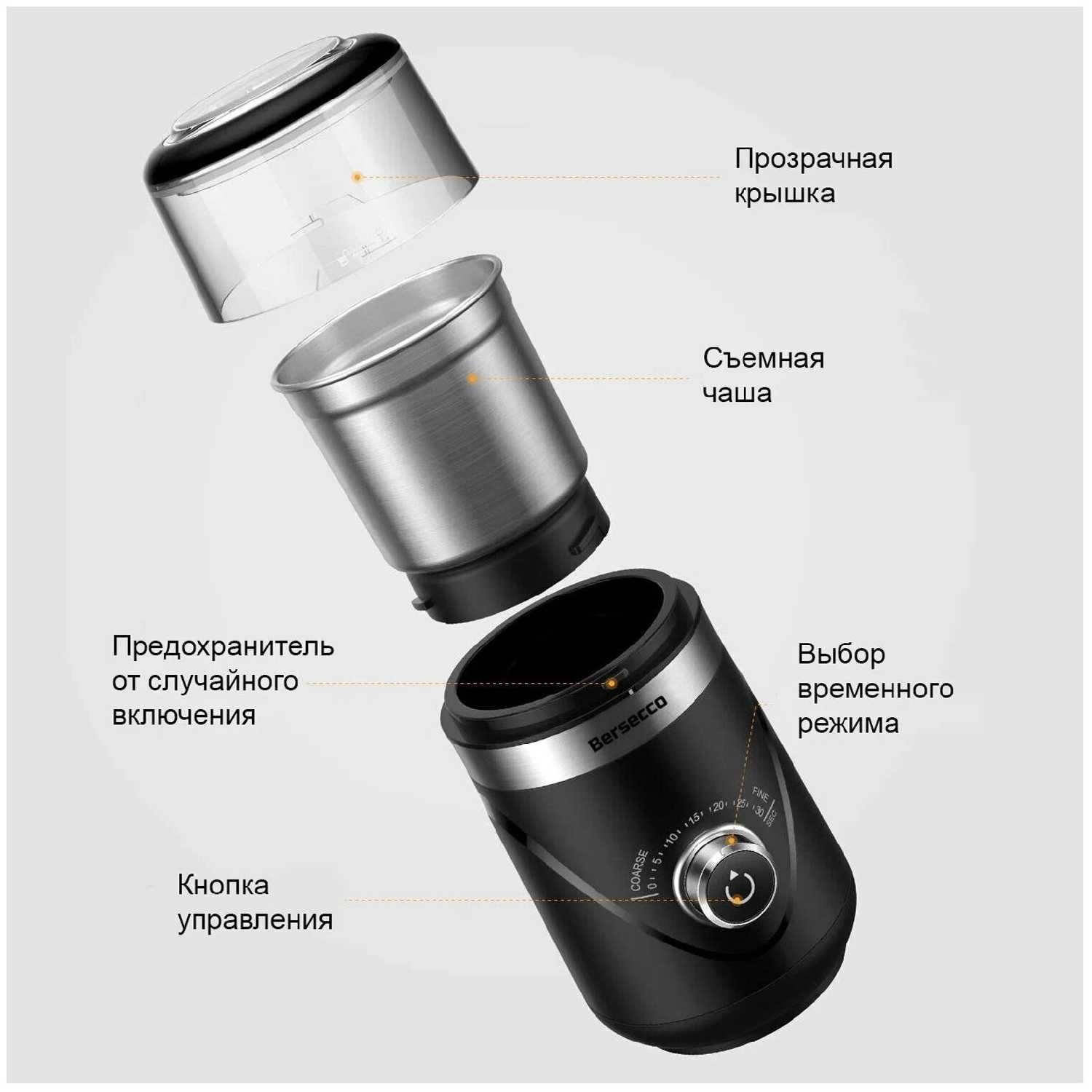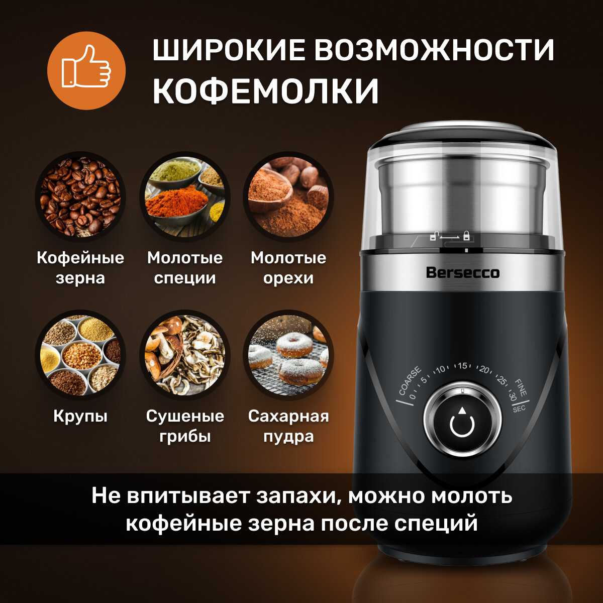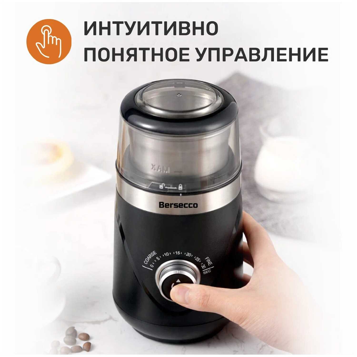 - + Есть регулировка степени помола от 0 до 30 секунд: 5- крупный помол, 10-15- средний помол и 20-30 мелкий помол. Съёмную чашу удобно чистить и мыть. Комфортная длина провода. Автоматический таймер