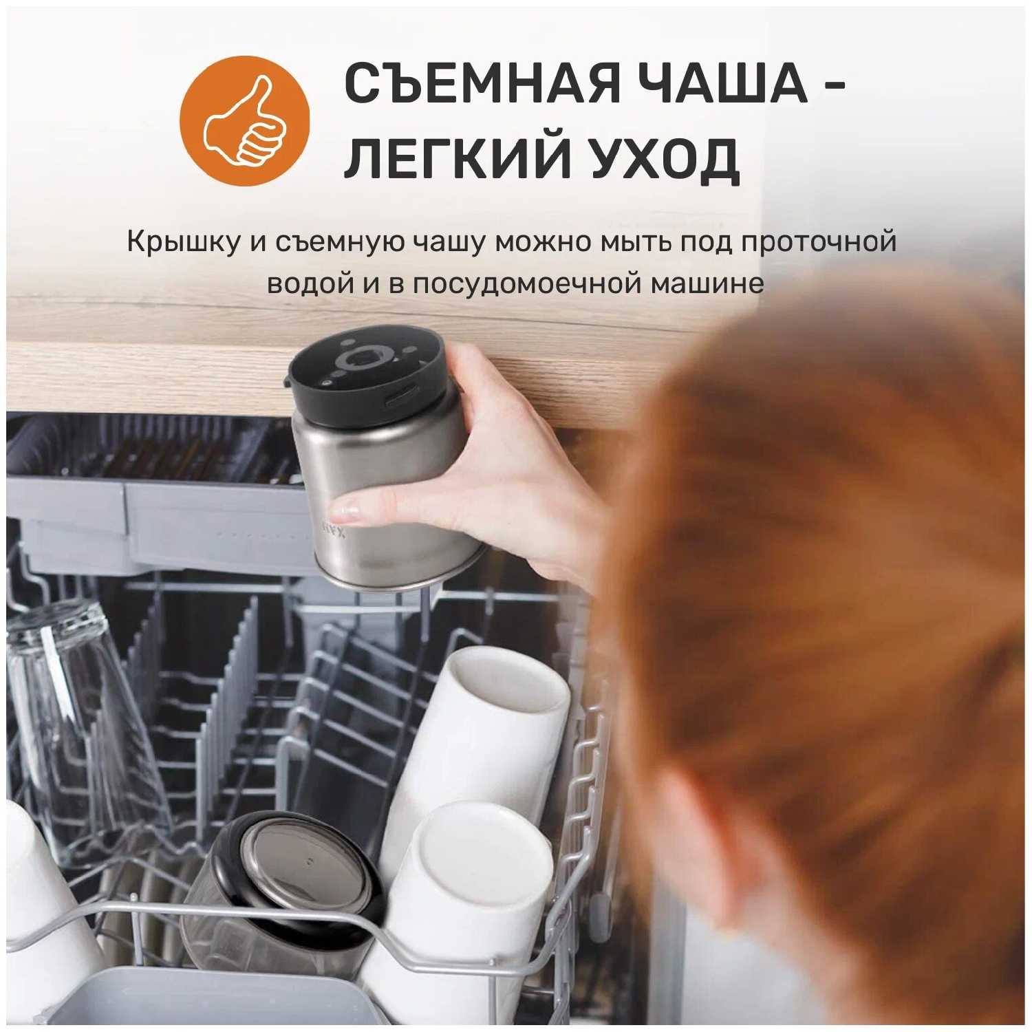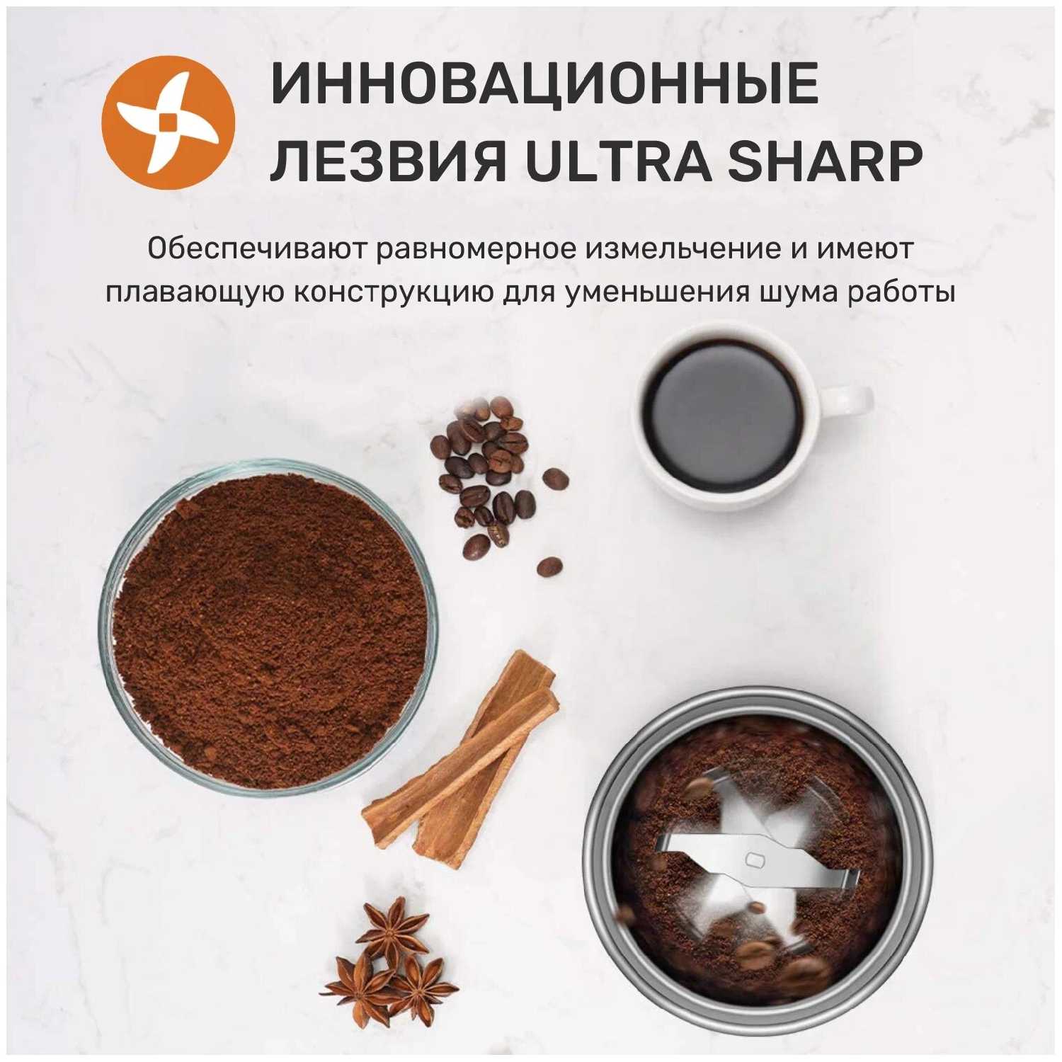 Компактная, из ударопрочного пластика (проверено!), быстро мелет кофе, практически бесшумная, есть разные степени помола кофе, лезвия очень острые. Интуитивно понятное и удобное управление - всего одна кнопка. Чашу кофемолки можно мыть как в раковине, так и в посудомоечной машине. Запаха кофе не остается после мытья. Довольна своей покупкой и не жалею, что выбрала именно эту кофемолку. Цена соответствует качеству