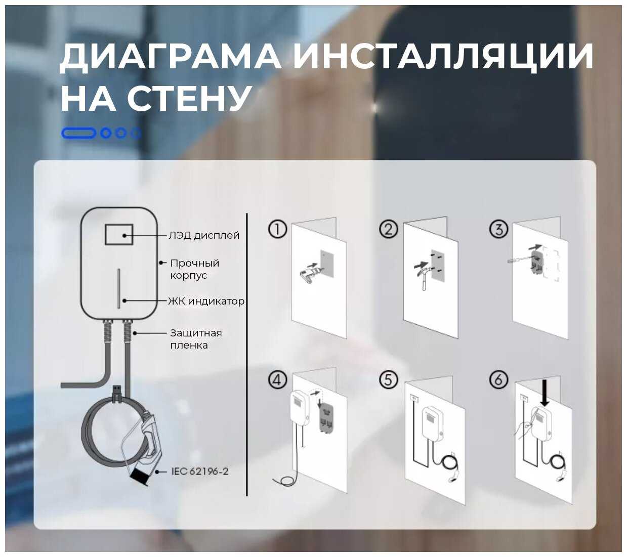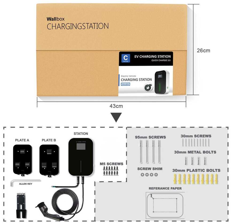 | Подробная комплектация : | 1) Зарядная станция WallBox 2) Кабель для подключения к сети (3 фазы) 3) Кабель и вход в электромобиль 4) Вспомогательные элементы для монтажа (гвозди, крючок для кабеля и тд) 5) Инструкция по монтажу, пуску и использованию |