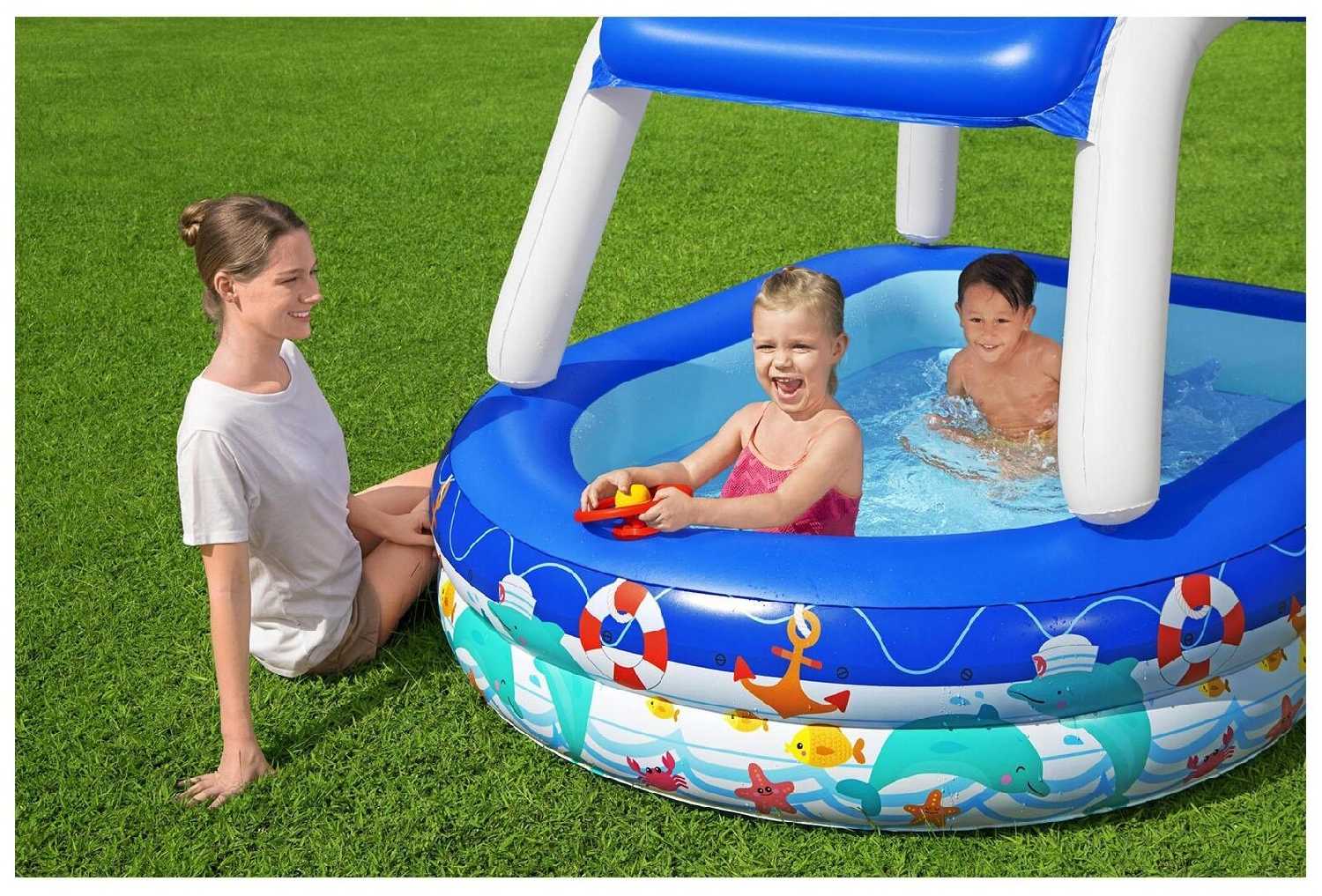 - + отличное качество, резина не тонкая. для малышей подходит, если налить половину, для постарше до 9 лет полное наполнение. крыша легко снимается, но крепится надежно на пластиковые защелки. купили в частный садик для активного использования