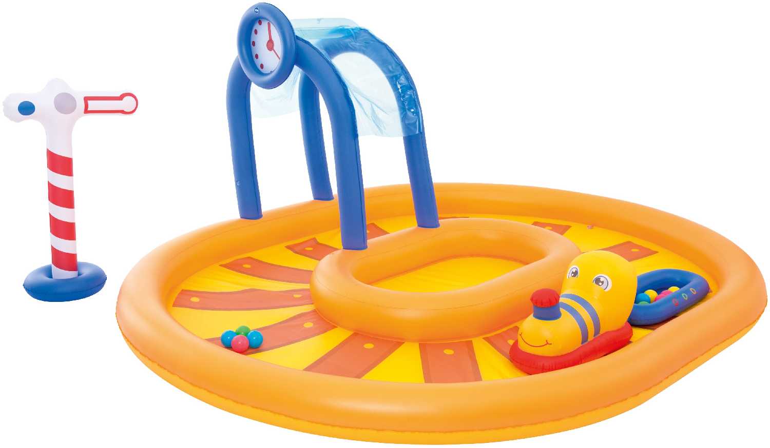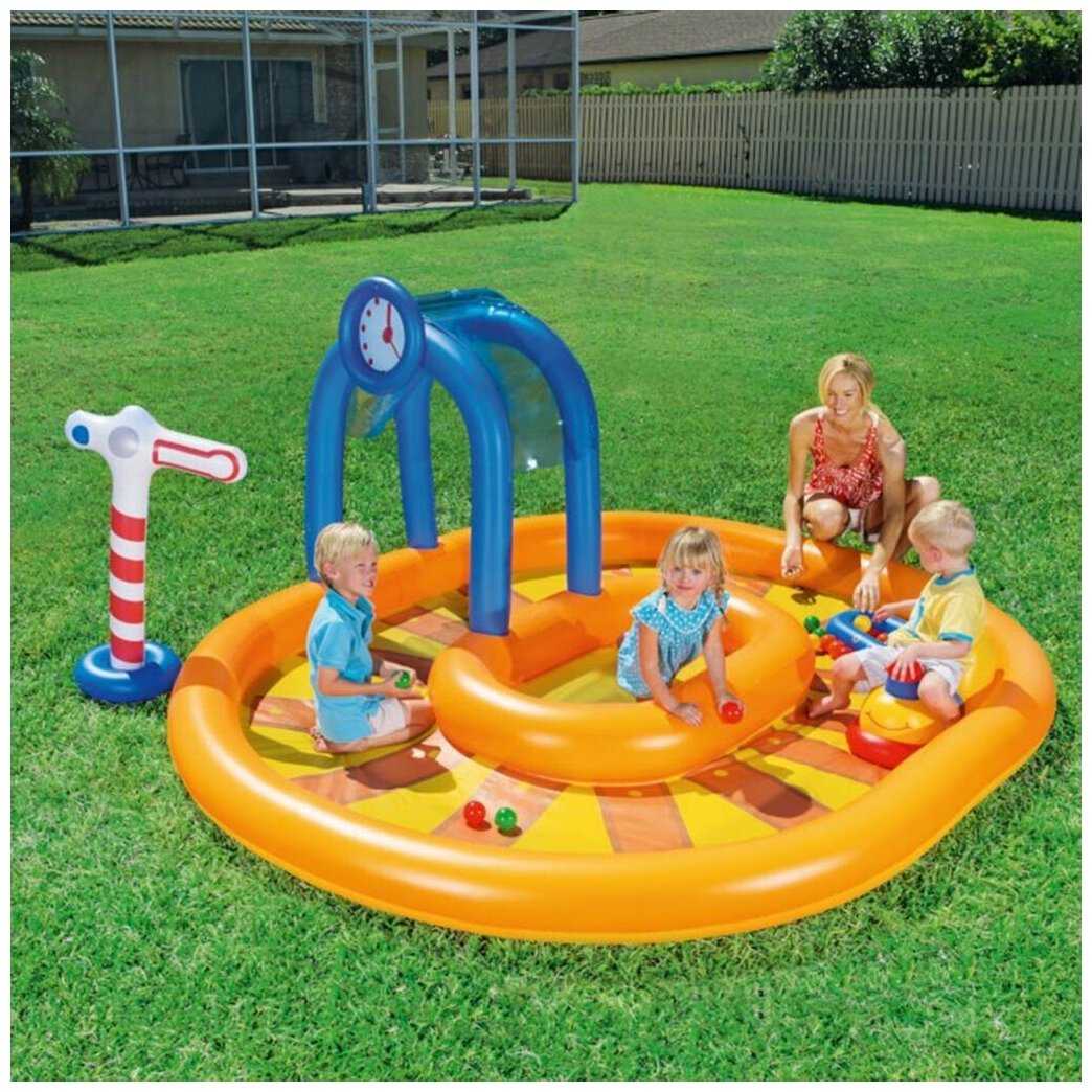 | Дополнительная информация : | в набор входят надувные игрушки: поезд вагон железнодорожный знак туннель 10 цветных мячиков, подключается к садовому шлангу |