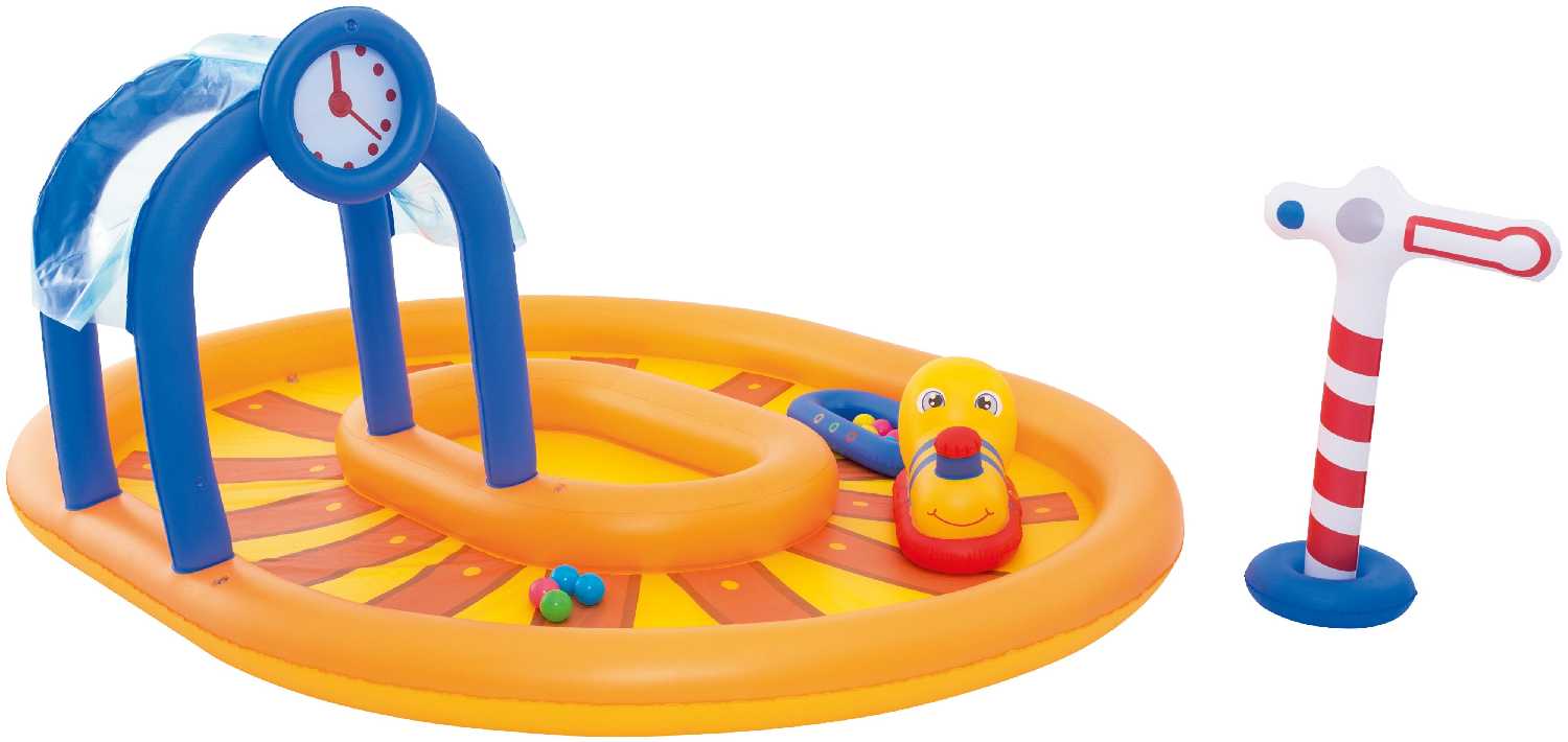 Дополнительная информация : | в набор входят надувные игрушки: поезд вагон железнодорожный знак туннель 10 цветных мячиков, подключается к садовому шлангу |