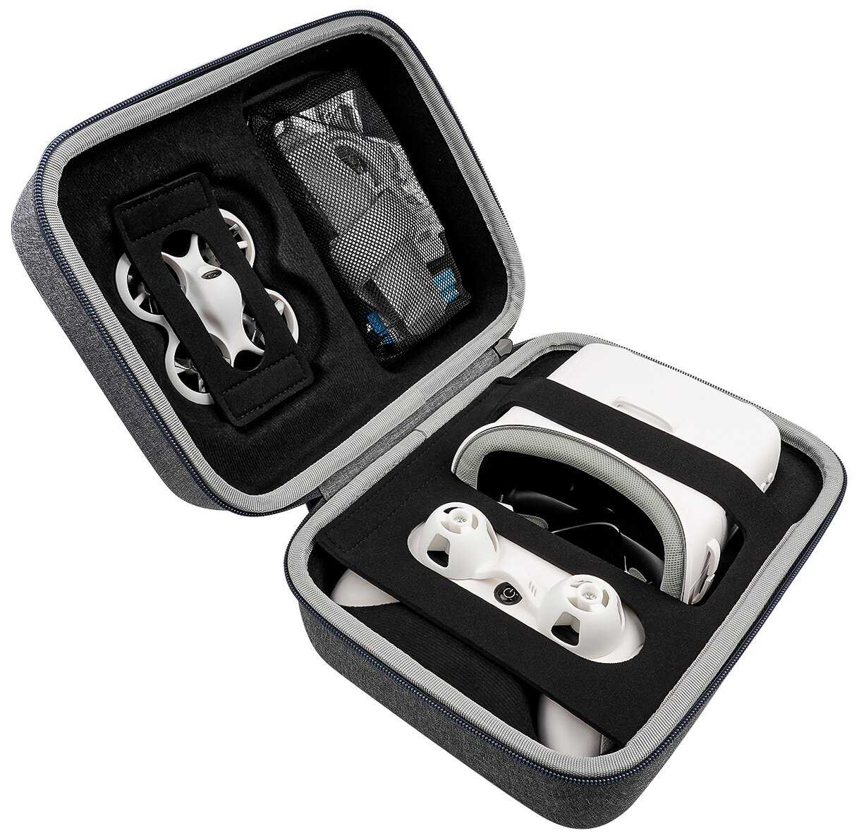 - Включает дрон, пульт, очки (или шлем), два аккумулятора, зарядное устройство, запасные пропеллеры, инструменты и удобный кейс для хранения и транспортировки.