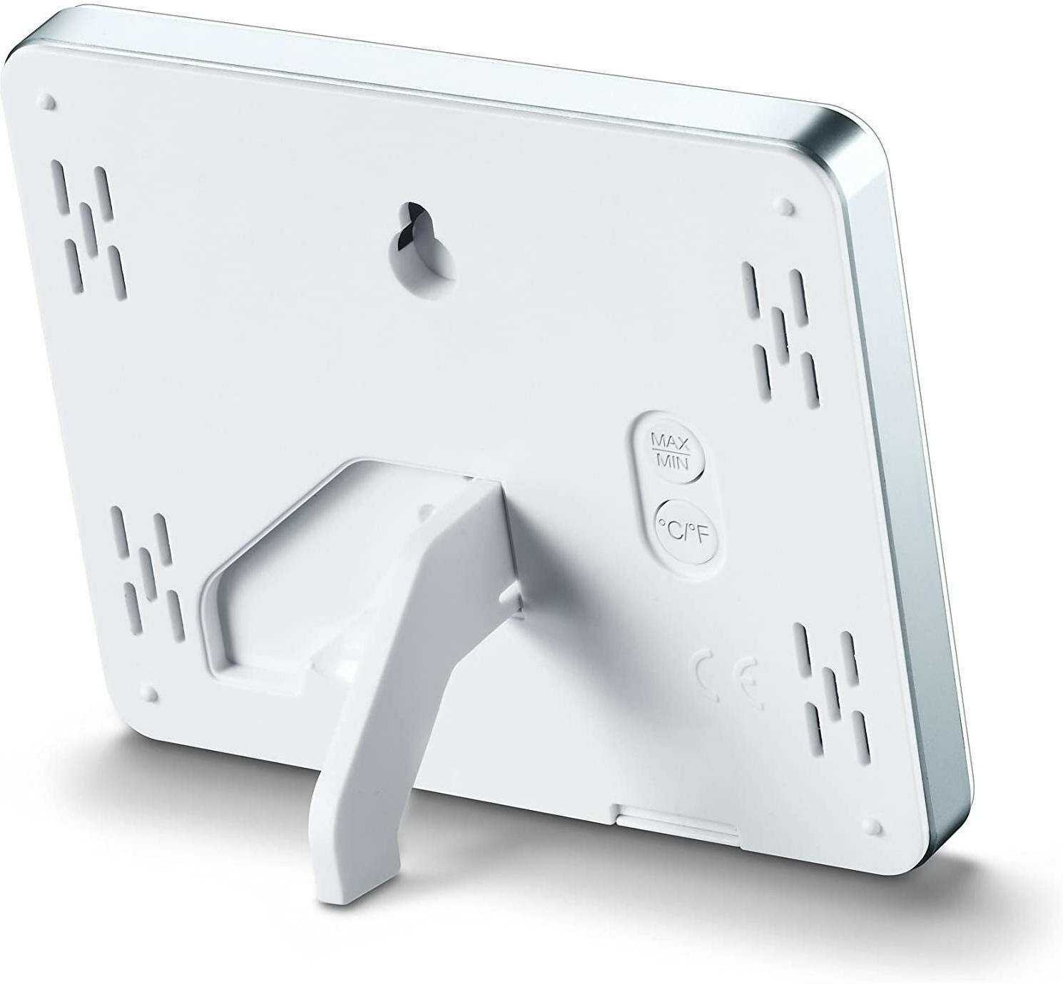 - + 2 варианта размещения - можно на стену закрепить, а можно на полку поставить. Дизайн универсален. Большой дисплей с большими цифрами. Долго держит батарейки. Показывает без погрешностей.