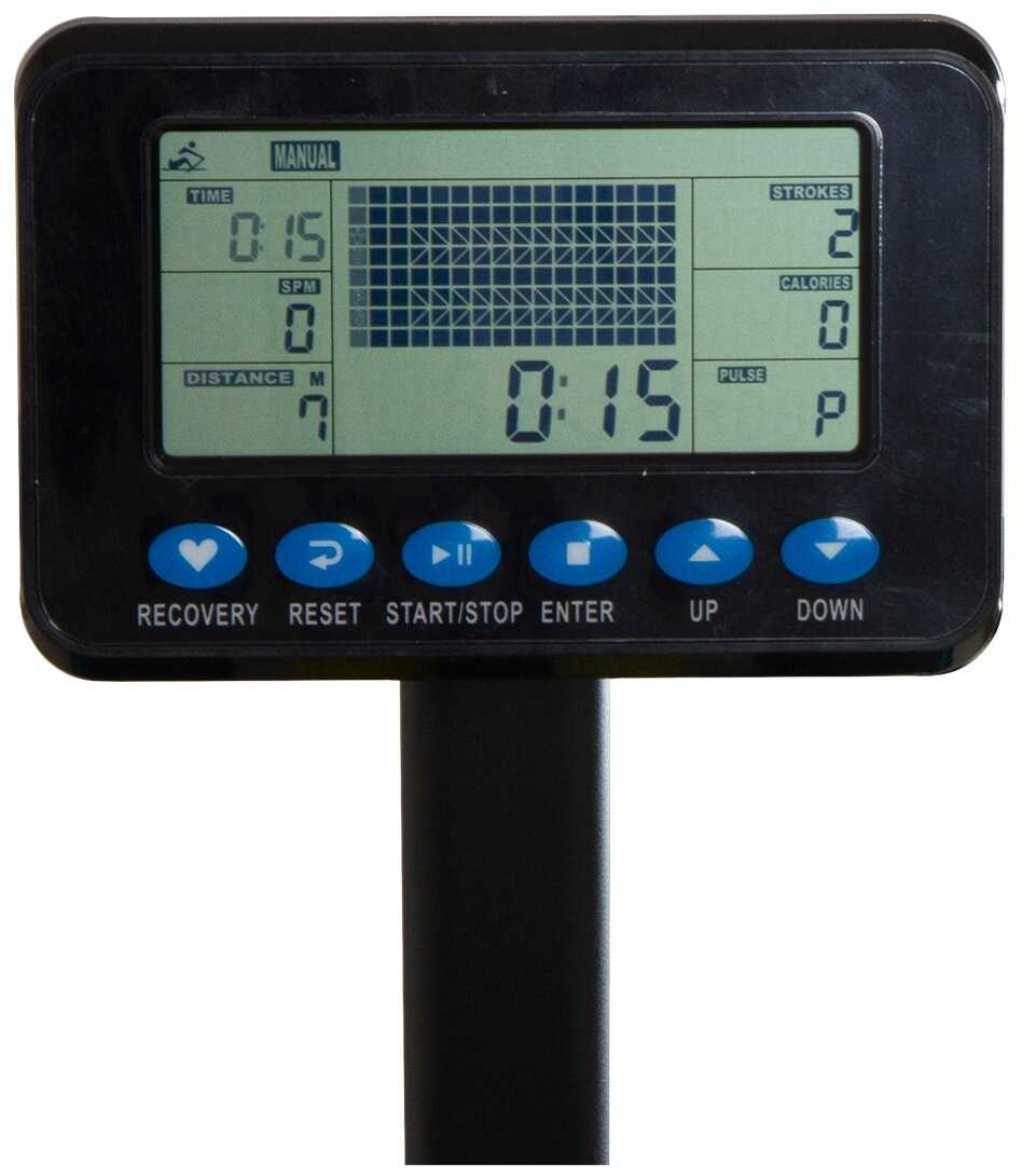 Показания дисплея : | время тренировки, количество гребков в минуту, количество гребков за тренировку, пройденная дистанция, пульс, расход калорий |