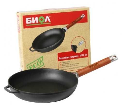 Чугун , съемная ручка, при правильной эксплуатации - вечная, дешевле сковородок с покрытием. Технология видимо измелась, т.к. стало проще подготовить к эксплуатации. Надо всего лишь вымыть с моющим средством, высушить на газу, нагреть и обработать подсолнечнмы маслом. Всё!!!