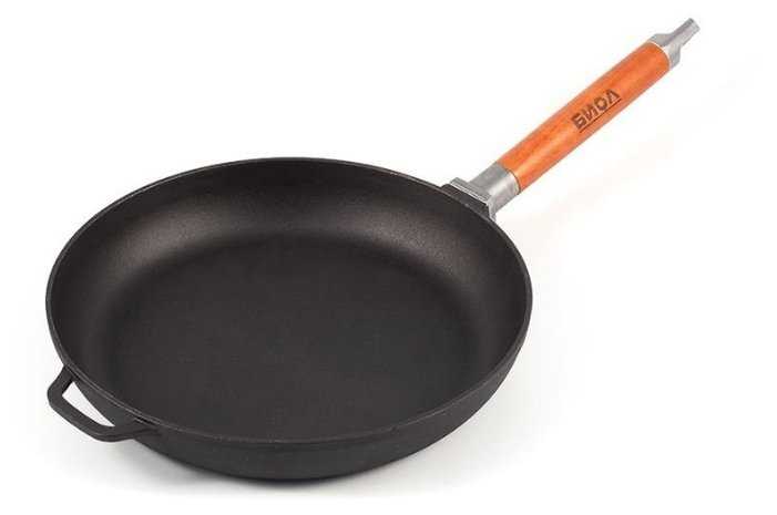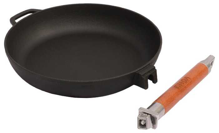 В целом - сковорода неплохая. Съемная ручка (из-за нее и купил). Объем на трех человек. Из минусов могу отметить немного грубоватое литье. В чем это выразилось? Ну во-первых, дно было немного не в плоскости, что будет заметно за стеклокерамических поверхностях. Взял абразивный диск и за пол-часа вывел дно в плоскость.