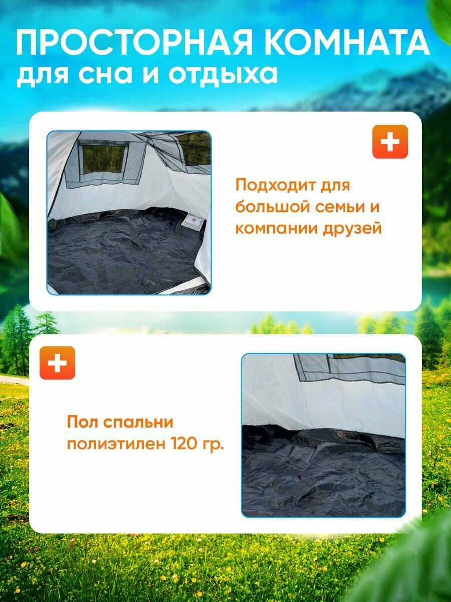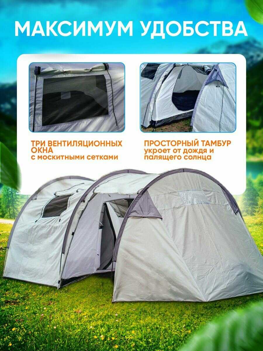 Стандартная комплектация содержит кармашек для мелочей и кольцо для подвешивания фонаря, что повышает удобство использования. Верхний тент защищает механизм раскладывания от прямого попадания осадков. Система двух входов обеспечивает сквозное проветривание в жаркую погоду. Однако наличие этих элементов зависит от конкретной поставки и может отличаться. -