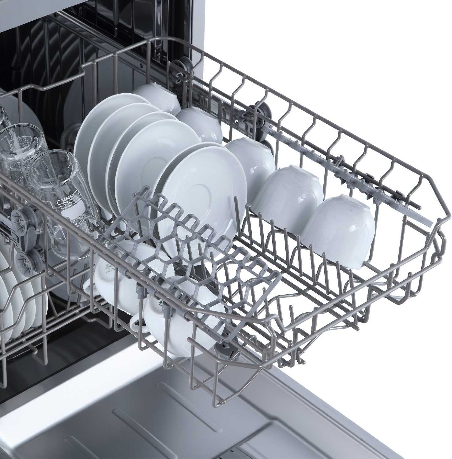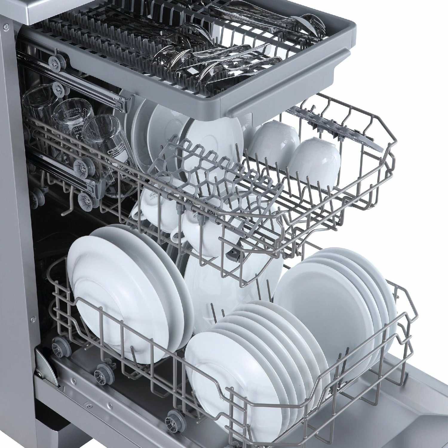 - Вмещает много посуды за счет отдельного лотка для приборов и трех разбрызгивателей.