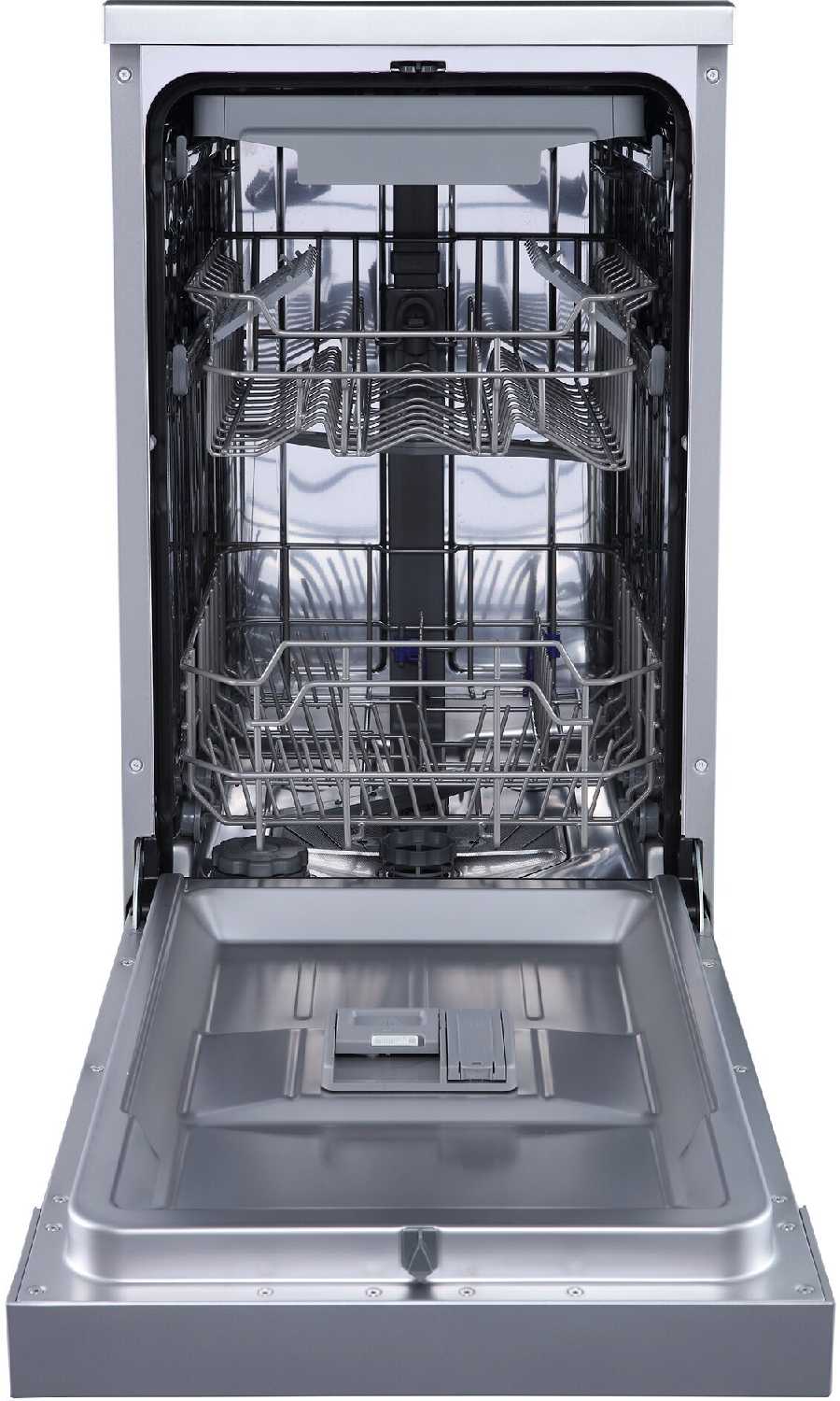 - Посуда выходит чистой и блестящей без ручной доработки, лучше чем руками с порошками и губками, вмещает 3 кастрюли по 2,5–5 л с крышками, тарелки и 10 кружек за цикл.