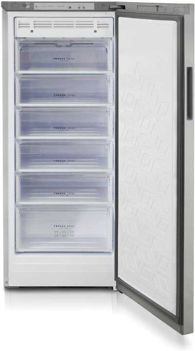 - Семь ящиков разного размера: верхний компактный для быстрой заморозки, пять средних для овощей/фруктов, нижний крупногабаритный для мяса.