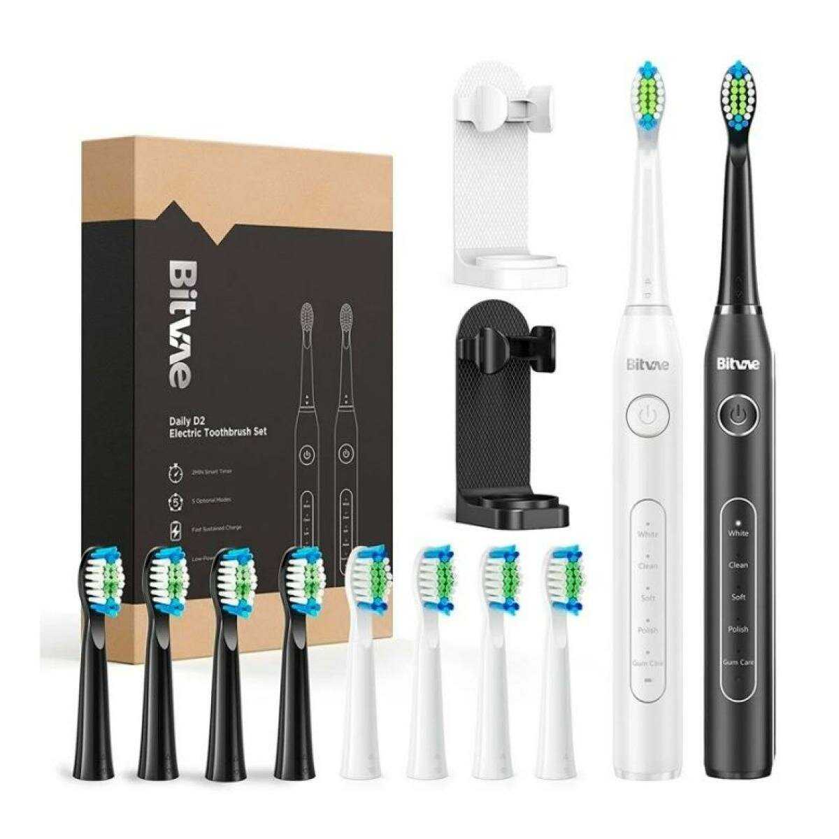 - В комплекте 4–8 сменных насадок разной формы, что позволяет использовать щетку нескольким людям или менять по мере износа.