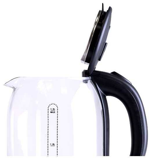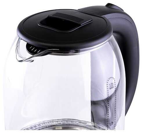 - + Бюджетный чайник. Лаконичный дизайн, синяя светодиодная подсветка, удобная ручка. Крышка открывается больше, чем на 90°